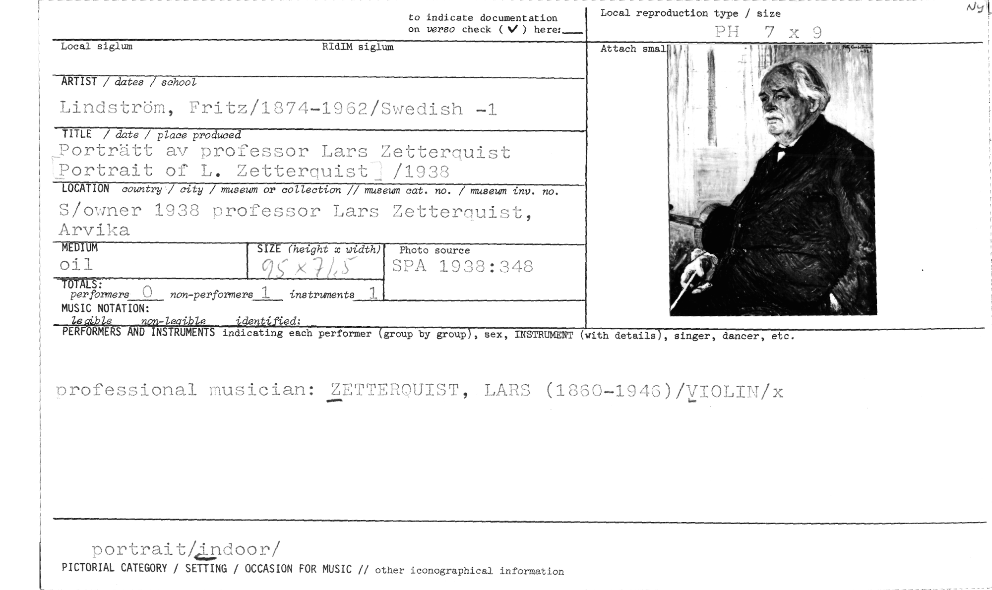 //// Local siglum //// RIdIM siglum //// to indicate documentation //// on verso check ( ) here:— //// ARTIST / datos / school //// Lindström, Fritz/1874-1962/Swedish -1 //// TITLE / date / place produced //// Porträtt av professor Lars Zetterquist IPortrait of L. Zettereuist /1938 //// LOCATION country / city / museum or collection // museum cat. no. / museum ini,. no. //// S/owner 1938 professor Lars Zetterauist, Arvika //// MEDIUM SIZE (height x width) //// cK /, //// ?OTALS: //// per formera fl non-parformers 1 instruments 1_ //// MUSIC NOTATION: //// lockble non-leaible identified; //// Photo source //// SPA 1938:348 //// PERFORMERS AND INSTRUMENTS indicating each performer (-group by group), sex, INSTRUMENT (with details), singer, dancer, etc. //// professional musician: ZETTERQUIST, LARS (1860-1946)/pOLIN/x //// portrait4Indoor/ //// PICTORIAL CATEGORY / SETTING / OCCASION FOR MUSIC // other conographical information //// Local reproduction type / size //// PT-, 7 x //// Attach smal ////