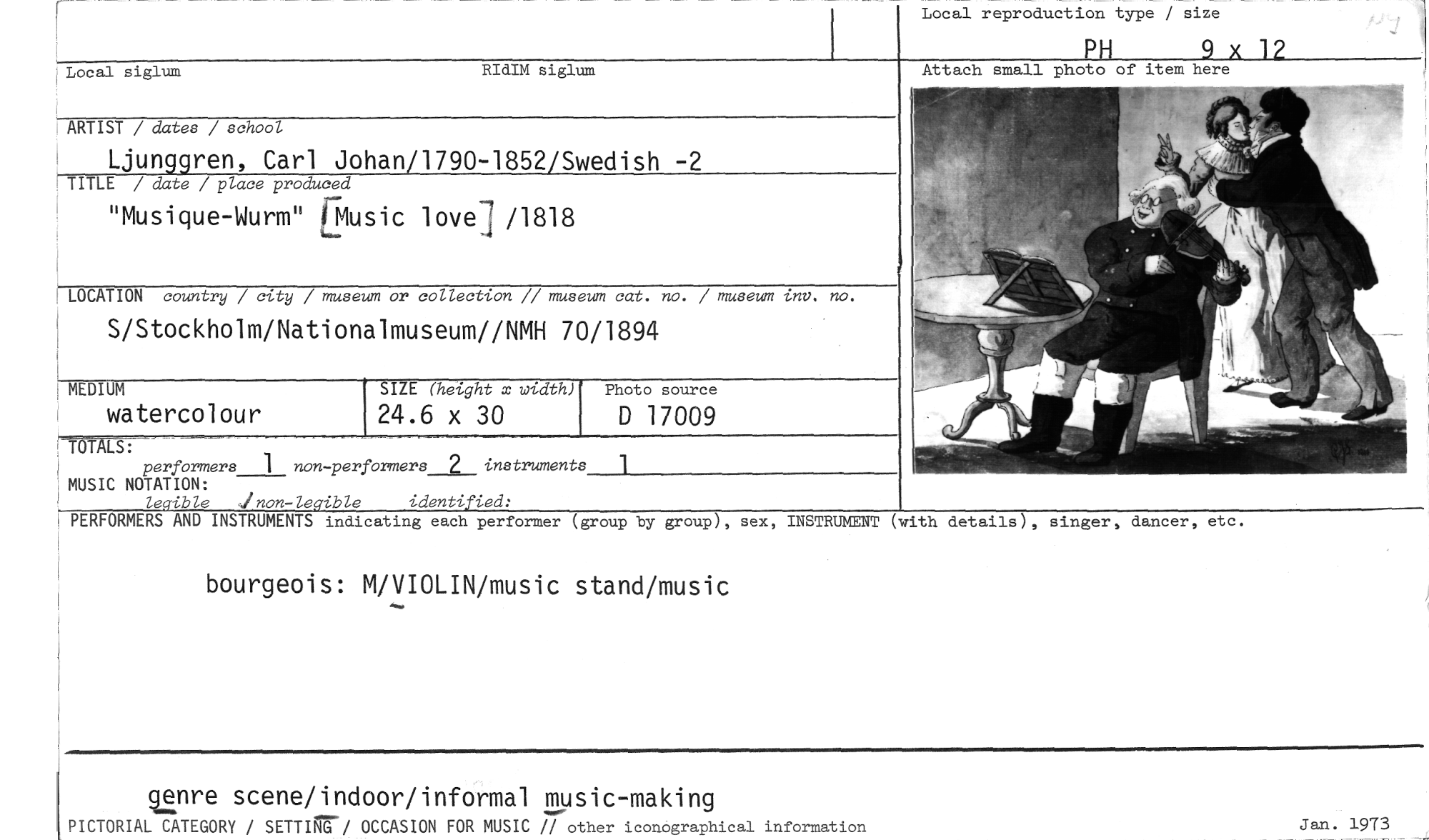 //// Local reproduction type / size //// PH 9 x 1? //// Local siglum RIdIM siglum //// Attach small photo of item here //// ARTIST / dates / school //// Ljunggren, Carl Johan/1790-1852/Swedish -2 //// TITLE / date / place produced //// "Musique-Wurm" Music lovel /1818 //// LOCATION country / city / museum or collection // museum cat. no. / museum inv. no. //// S/Stockholm/Nationalmuseum//NMH 70/1894 //// parformers 1 non-parformers //// MUSIC NOTATION: //// legible identified: //// 1 //// 2 instruments //// PERFORMERS AND INSTRUMENTS indicating each performer (group by group), sex, INSTRUMENT //// (with details), singer, dancer, etc. //// bourgeois: M/VIOLIN/music stand/music //// genre scene/indoor/informal music-making //// PICTORIAL CATEGORY / SETTING / OCCASION FOR MUSIC // other iconographical information //// Jan. 1973 //// Photo source //// D 17009 //// MEDIUM //// watercolour //// ' SIZE (height x width) //// 24.6 x 30 ////