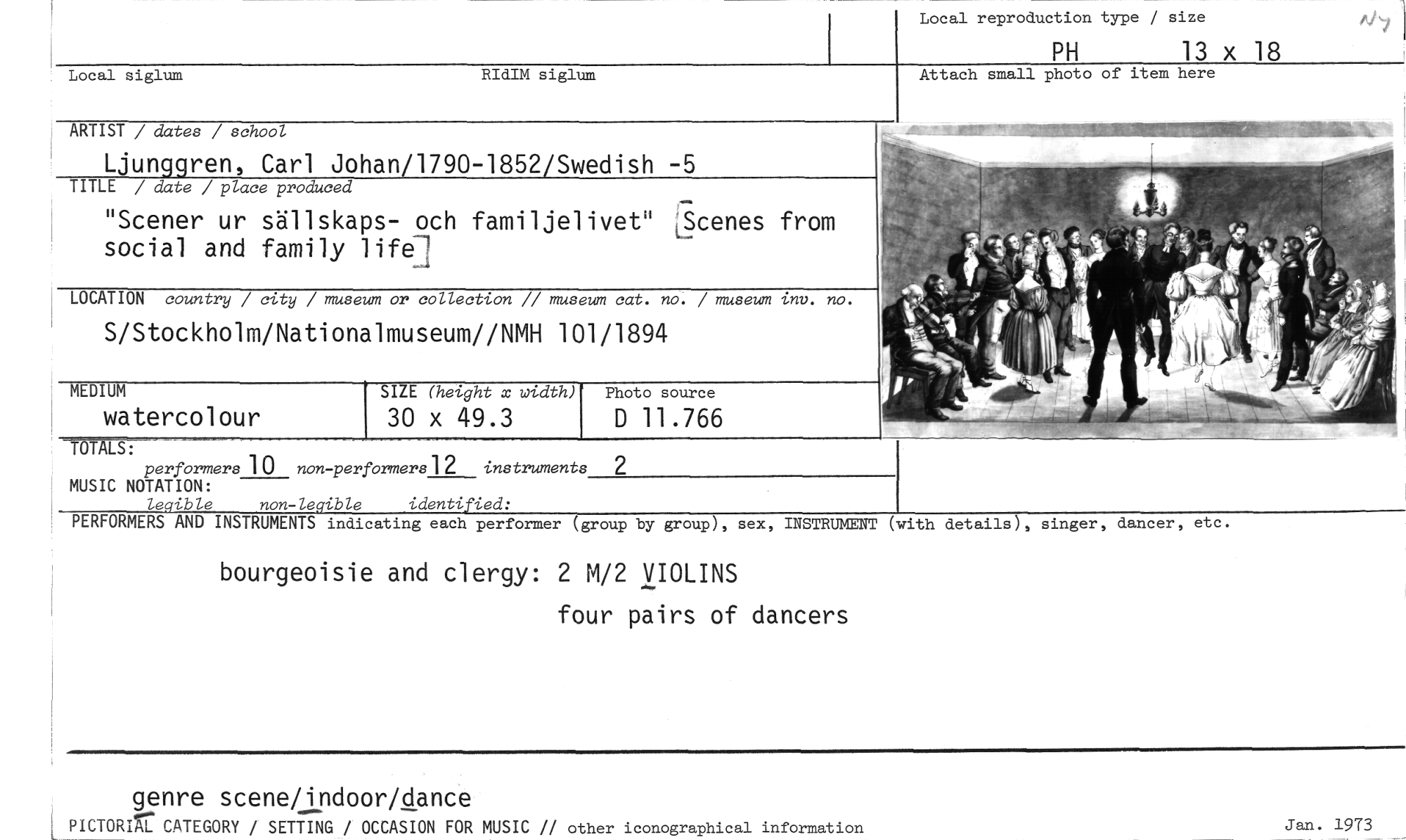 //// bourgeoisie and clergy: 2 M/2 VIOLINS //// four pairs of dancers //// TOTALS: //// performers 10 non-per formers12 instruments 2 MUSIC NOTATION: //// legible non-legible identified: //// PERFORMERS AND INSTRUMENTS indicating each performer (group by group), sex, //// Local siglum RIdIM siglum //// ARTIST / dates / school //// Ljunggren, Carl Johan/1790-1852/Swedish — //// TITLE / date / place produced //// "Scener ur sällskaps- och familjelivet" LScenes from social and family life1 //// LOCATION country / city / museum or collection // museum ca t. no. / museum vav. no. //// 1 S/Stockholm/Nationalmuseum//NMH 101/1894 //// MEDIUM SIZE (height x width) //// watercolour 30 x 49.3 //// Photo source //// D 11.766 //// Local reproduction type / size //// PH 13 x 18 //// Attach small photo of item here //// INSTRUMENT (with details), singer, dancer, etc. //// genre scene/indoor/dance //// PICTORIr CATEGORY / SETTING / OCCASION FOR MUSIC // other iconographical information //// Jan. 1973 ////