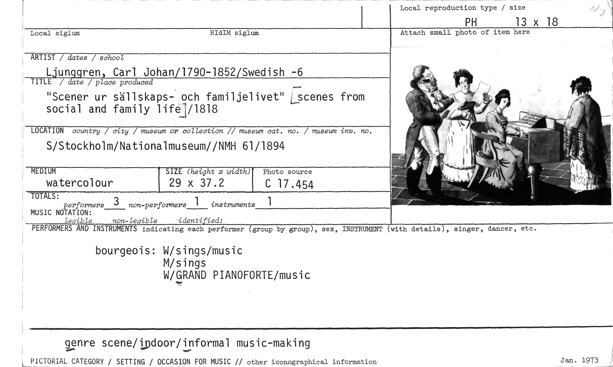 //// Local reproduction type / size //// PH 13 x 18 //// bourgeois: W/sings/music //// M/sings //// W/GRAND PIANOFORTE/music //// Attach small photo of item here //// Local siglum RIdIM siglum //// MEDIUM SIZE (height x width) //// Photo source //// INSTRUMENT //// (with details), singer, dancer, etc. //// ARTIST / dates / school //// Ljunqqren, Carl Johan/1790-1852/Swedish -6 TITLE / date / place produced //// "Scener ur sällskaps- och familjelivet" Lscenes from social and family lifel/1818 //// LOCATION country / city / museum or collection // museum cat. no. / museum 2nv. no. //// S/Stockholm/Nationalmuseum//NMH 61/1894 //// watercolour 29 x 37.2 C 17.454 //// OTALS: //// performers o non-performers 1 instruments 1 MUSIC NOTATION: le ible non-le ible identi ied: PERFORMERS AND INSTRUMENTS indicating each performer (group by group), sex, //// genre scene/ipdoor/informal music-making //// L PICTORIAL CATEGORY / SETTING / OCCASION FOR MUSIC // other iconographical information Jan. 1973 ////