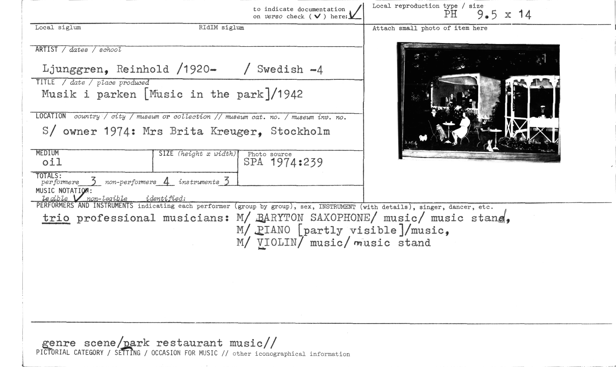 //// to indicate documentation on versa check (V) here: //// Local reproduction type / size //// PH 9.5 x 14 //// Local siglum RIdIM siglum //// ARTIST / dates / school //// Ljunggren, Reinhold /1920— / Swedish —4 //// TITLE / date / place produced //// Musik i parken [Music in the park]/1942 //// LOCATION country / city / museum or collection // museum cat. no. / museum inv. no. //// S/ owner 1974: Mrs Brita Kreuger, Stockholm //// MEDIUM SIZE (height x width) Photo source //// oll SPA 1974:239 //// T LS: 3 non-performers_AL instruments 3 //// performers //// Attach small photo of item here //// MUSIC NOTATIO: //// led,b/e non-leaible identified: //// PERFORMERS AND INSTRUMENTS indicating each performer //// trio professional musicians: //// //// (group by group), sex, INSTRUMENT (with details), singer, dancer, etc. A //// 11/,13,41RYTON SAXOPHONE/ music/ music stand, M/ [partly visible]/music, //// M/ VIOLIN/ music/ music stand //// //// genre scene/ggrk restaurant music// //// PICTÖRIAL CATEGORY / SE/ING / OCCASION FOR MUSIC // other iconographical information ////