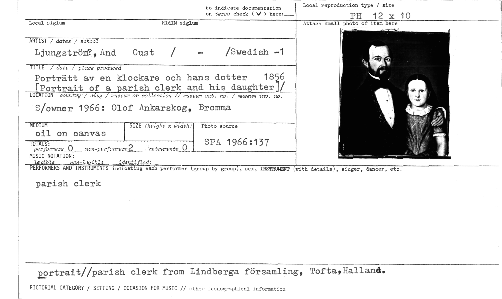 //// to indicate documentation on versa check (N, ) here: //// Local reproduction type / size //// PH 12 x 10 //// Local siglum RIdIM siglum //// ARTIST / dates / school //// Ljungström?,And Gust / — /Swedish —1 //// TITLE / date / place produced //// Porträtt av en klockare och hans dotter 1856 [Portrait of a parish clerk and his daughterj/ //// LOCATION country / city / museum or collection // museum cat. no. / museum inv. no. //// S/owner 1966: Olof Ankarskog, Bromma //// MEDIUM //// oil on canvas //// TO L- TIC Si //// per formers (..) non-performers2 astruments 0 //// MUSIC NOTATION: //// leaible non-leaible identified; //// PERFORMERS AND INSTRUMENTS indicating each performer (group by group), sex, //// parish clerk //// SIZE (height x width) //// Photo source //// SPA 1966:137 //// Attack small photo of item here //// INSTRUMENT (with details), singer, dancer, etc. //// portrait//parish clerk from Lindberga församling, ToftatHalland. //// PICTORIAL CATEGORY / SETTING / OCCASION FOR MUSIC // other iconographical information ////