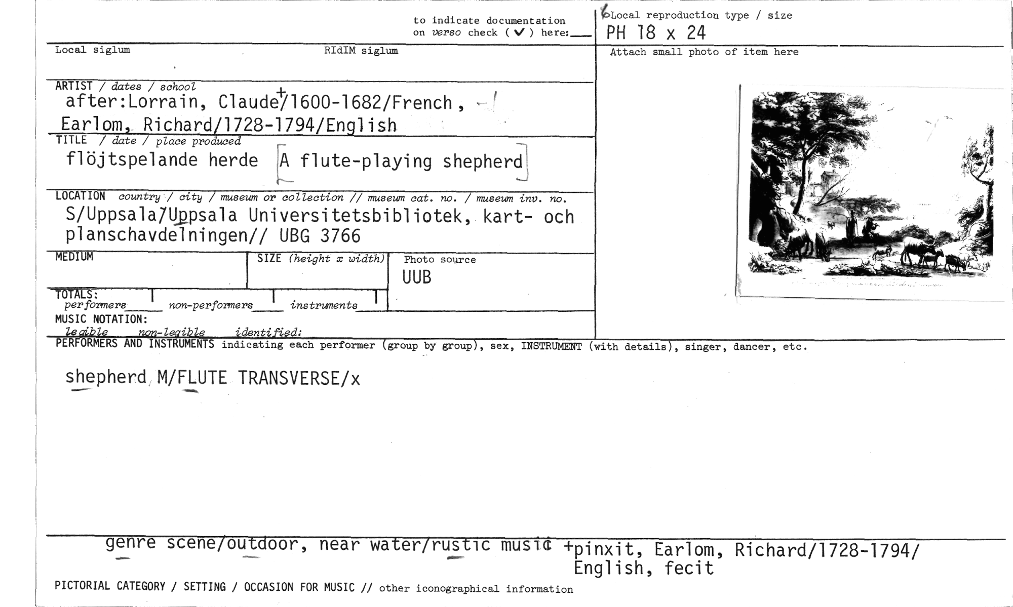 //// to indicate documentation //// on verso check ( ) here:_ //// kocal reproduction type / size //// PH 18 x 24 //// Local siglum RIdIM siglum Attach small photo of item here //// ARTIST / dates / school //// after:Lorrain, Claude/1600-1682/French, Earlom, Richard/1728-1794/English //// TITLE / date / place produced //// flöjtspelande herde A flute-playing shepherd //// LOCATION country / city / museum or collection // museum cat. no. / museum inv. no. //// S/Uppsala7Uppsala Universitetsbibliotek, kart- och planschavdelningen// UBG 3766 //// MEDIUM //// 76.17(17-1M //// per formers non-performers instruments //// MUSIC NOTATION: //// leoible non-lesible identifYed: //// PERFORMERS AND INSTRUMENTS indicating each performer (group by group), sex, INSTRUMENT (with details), singer, dancer, etc. //// SIZE (hetght x undth) Photo source //// UUB //// //// shepherd M/FLUTE TRANSVERSE/x //// genre scene/outdoor, near water/rustic music //// inxit, Earlom, Richard/1728-1794/ //// English, fecit //// PICTORIAL CATEGORY / SETTING / OCCASION FOR MUSIC // other iconographical information ////