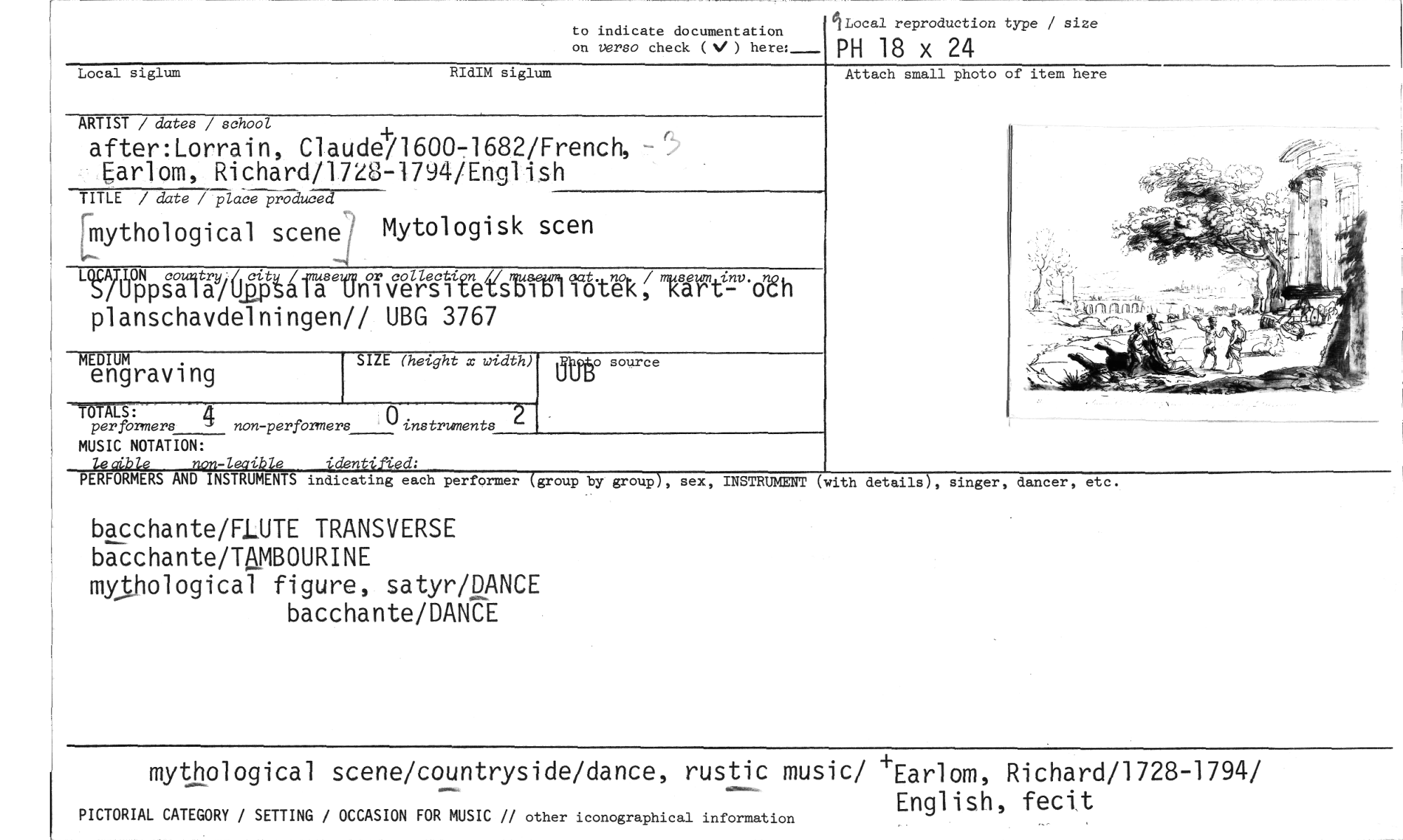 //// to indicate documentation on verso check (V ) here: //// 1Local reproduction type / size //// PH 18 x 24 //// Local siglum RIdIM siglum //// ARTIST / dates / school //// after:Lorrain, Claud0160071682/French, earlom, Richard/17Z8-1794/English //// TITLE / date / place produced //// ;mythological scened Mytologisk scen //// Lenpjauitz4627)Äå ras e'en //// ieliiitnefstierl Tåtel< ; Uff:2'ot h planschavdelningen// UBG 3767 //// SIZE (height x width) //// —MALS: //// per forners 4 non-performers ()instruments //// MUSIC NOTATION: //// leable non-leorible identilY.ed; //// PERFORMERS AND INSTRUMENTS indicating each performer (group by group), //// bacchante/FLUTE TRANSVERSE //// bacchante/TMBOURINE //// mythological figure, satyr/DANCE //// bacchante/DANCE //// MEDIUM //// engraving //// Otto source //// Attach small photo of item here //// sex, INSTRUMENT (with details), Singer, dancer, etc. //// mythological scene/countryside/dance, rustic music/ i-Earlom, Richard/1728-1794/ //// PICTORIAL CATEGORY / SETTING / OCCASION FOR MUSIC // other iconographical information //// English, fecit ////