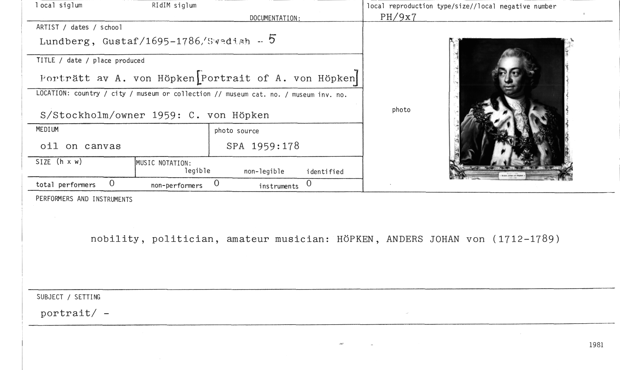 //// 1981 //// MUSIC NOTATION: //// legible //// non-legible identified //// photo //// 0 //// 0 //// 0 //// total performers //// non-performers //// instruments //// local siglum RIdIM siglum //// DOCUMENTATION. //// ARTIST / dates / school //// Lundberg, Gustaf/1695-1786/S•dish - 5 //// TITLE / date / place produced //// Porträtt av A. von Höpken[Portrait of A. von Höpken //// LOCATION: country / city / museum or collection // museum cat. no. / museum inv. no. //// S/Stockholm/owner 1959: C. von Höpken //// photo source //// SPA 1959:178 //// SIZE (h x w) //// PERFORMERS AND INSTRUMENTS //// nobility, politician, amateur musician: HÖPKEN, ANDERS JOHAN von (1712-1789) //// SUBJECT / SETTING //// portrait/ //// local reproduction type/size//local negative number //// PH/9x7 //// MEDIUM //// oil on canvas ////