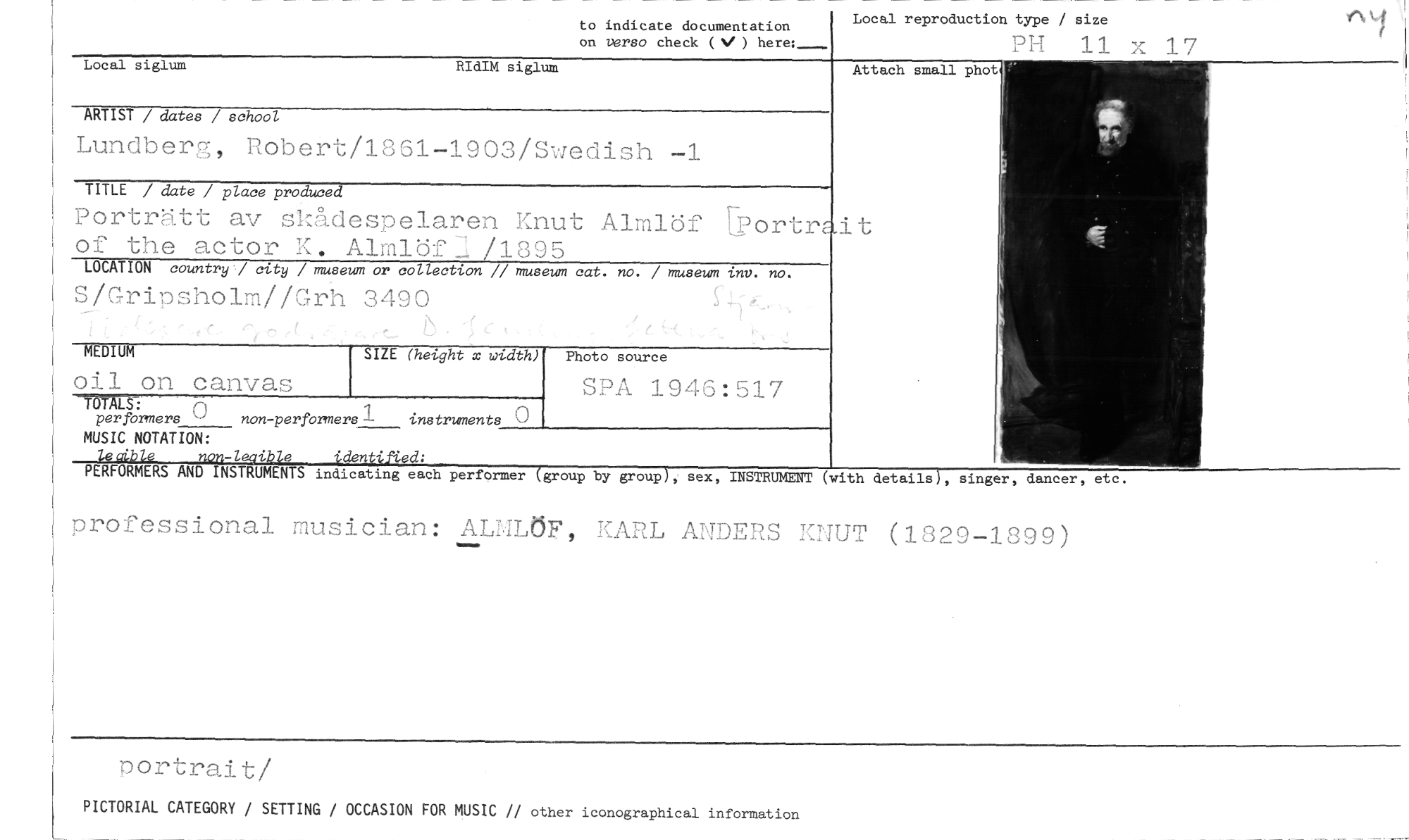 //// to indicate documentation on verso check (NI ) here: //// Local reproduction type / size //// PH 11 x 17 //// Local siglum RIdIM siglum //// ARTIST / dater / school. //// Attach small phot //// Lundberg, Robert/1861-1903/Swedish -1 //// TITLE / date / place produced //// Porträtt av skådespelaren Knut Almlöf Portrait of the actor K. Almlöf Il /1895 //// LOCATION country1 city / museum or collection // museum cat. no. / museum inv. no. //// S/Gripsholm//Grh 3490 //// MEDIUM //// SIZE (height x width) //// Photo source //// oil on canvas //// SPA 1946:517 //// TOTALS: //// per formera (3 non-performers" instruments //// MUSIC NOTATION: //// lecib/e non-leaible identified: //// PERFORMERS AND INSTRUMENTS indicating each //// performer (group by group), sex, INSTRUMENT (with details), singer, daner, etc. //// professional musician: ALMLÖF, KARL ANDERS KNUT (1829-1899) //// portrait/ //// PICTORIAL CATEGORY / SETTING / OCCASION FOR MUSIC // other iconographical information ////
