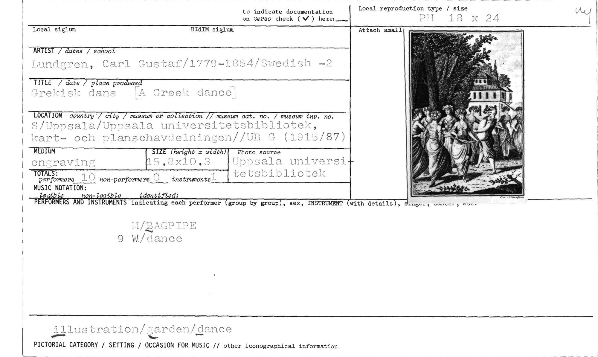 //// to indicate documentation //// on perso check (v. ) here:_ //// Local reproduction type / size //// P51 18 x 24 //// Attach small //// RIdIM siglum //// Local siglum //// ustaf/1779-1854/Swedish -2 //// ARTIST / dater / school //// Lundgren, Carl //// Greek dancel //// TITLE / date / place produced //// Grekisk dans >A //// a universitetsbibliotek, havdelningennUB G (1915/87) //// LOCATION countryj city / museum or collection // museum cat. no. / museum tnv. no. //// S/Uppsala/Uppsal //// kart- och plansc //// MEDIUM //// enr:raving //// Photo source //// Uppsala universi tetsbibliotek //// SIZE (height x width) //// 15.2x10.3 //// TOTALS: //// per formers i 0 non-performerm () instrumental //// MUSIC NOTATION: //// lecible non-lecible identified; //// PERFORMERS AND INSTRUMENTS indicating eaeh performer //// group by group , sex, INSTRUMENT (with details), //// M/k4AGPIPE 9 W/dance //// illustrationharden/dance //// PICTORIAL CATEGORY / SETTING / OCCASION FOR MUSIC // other iconographical information ////