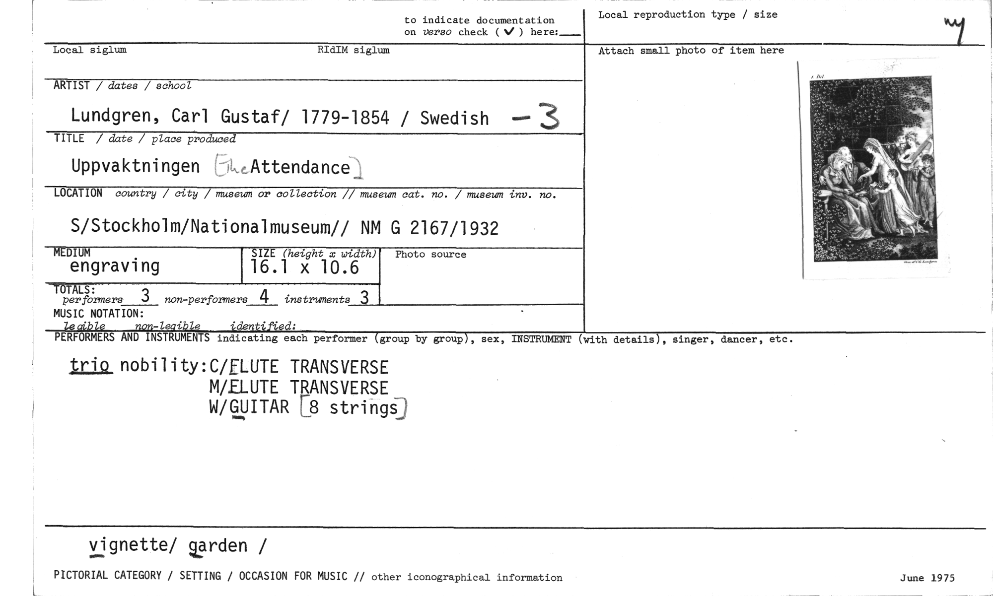 //// to indicate documentation //// on verso check ) here:— //// Local reproduction type / size //// Attach small photo of item here //// Local siglum RIdIM siglum //// ARTIST / dates / school //// Lundgren, Carl Gustaf/ 1779-1854 / Swedish -- //// TITLE / date / place produced //// Uppvaktningen ,cAttendance_;. //// Photo source //// MEDIUM //// engraving //// SIZE (height x wydth) //// 16.1 x 10.6 //// LOCATION country / city / museum or collection // museum cat. no. / museum inv. no. //// S/Stockholm/Nationalmuseum// NM G 2167/1932 //// •.) //// per formers J non-performers 4 instruments 3 //// MUSIC NOTATION: //// non-leaible identifted: //// PERFORMERS AND INSTRUMENTS indicating each performer (group by group), sex, //// trio nobility:C/ELUTE TRANSVERSE M/ELUTE TRANSVERSE W/GUITAR [8 strings) //// INSTRUMENT (with details), singer, dancer, etc. //// vignette/ Garden / //// PICTORIAL CATEGORY / SETTING / OCCASION FOR MUSIC // other iconographical information June 1975 ////