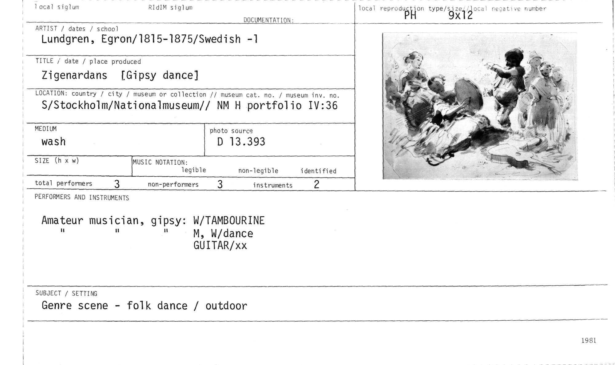 //// lotal siglum RIdIM siglum //// DOCUMENTATION: //// ARTIST / dates / school //// Lundgren, Egron/1815-1875/Swedish -1 //// TITLE / date / place produced //// Zigenardans [Gipsy dance] //// LOCATION: country / city / museum or collection // museum cat. no. / museum inv. no. //// S/Stockholm/Nationalmuseum// NM H portfolio IV:36 //// photo source //// D 13.393 //// SIZE (h x w //// non-legible identified //// local reprodiglon type/size xIZ.L/local negative nutuber //// 9 //// MEDIUM //// wash //// MUSIC NOTATION: //// legible //// total performers 3 non-performers instruments 2 //// PERFORMERS AND INSTRUMENTS //// Amateur musician, gipsy: W/TAMBOURINE H " M, W/dance //// GUITAR/xx //// SUBJECT / SETTING //// Genre scene - folk dance / outdoor //// 1981 ////