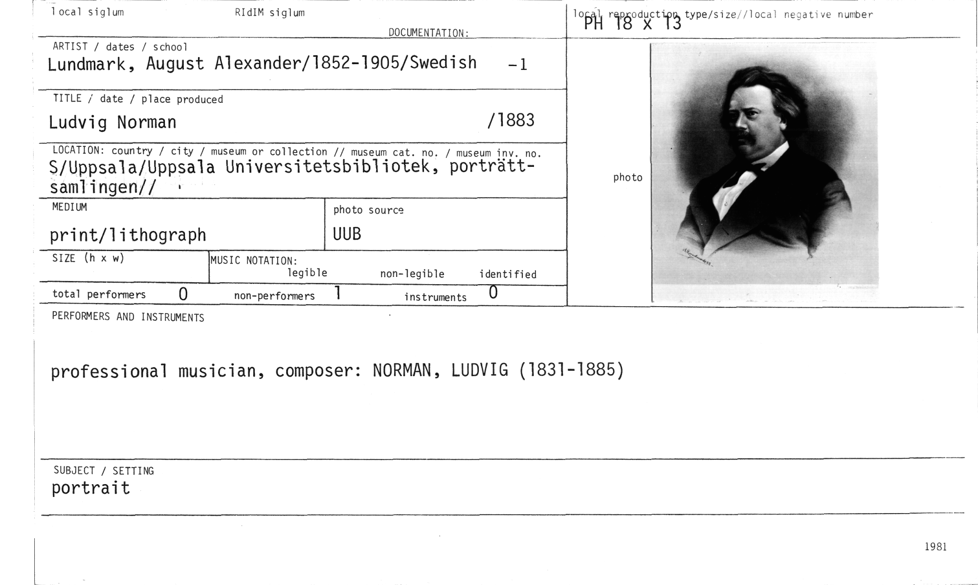 //// 1 ocal siglum RIdIM siglum //// DOCUMENTATION: //// log reitodkctin type/size//local negative nurober //// ARTIST / dates / school //// Lundmark, August Alexander/1852-1905/Swedish //// TITLE / date / place produced //// Ludvig Norman /1883 //// LOCATION: country / city / museum or collection // museum cat. no. / museum inv. no. //// S/Uppsala/Uppsala Universitetsbibliotek, porträttsamlingen// //// MEDIUM //// print/lithograph //// SIZE (h x w) //// non-legible identified //// total performers O non-performers 1 instruments O //// photo //// //// MUSIC NOTATION: //// legible //// photo source //// UUB //// PERFORMERS AND INSTRUMENTS //// professional musician, composer: NORMAN, LUDVIG (1831-1885) //// SUBJECT / SETTING //// portrait //// 1981 ////