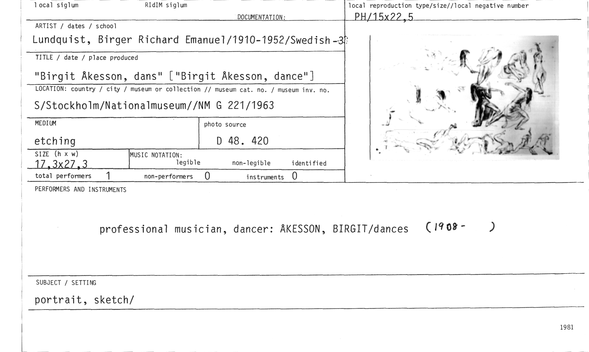//// PERFOMIERS AND INSTRUMENTS //// professional musician, dancer: ÅKESSON, BIRGIT/dances (1909—) //// SUBJECT / SETTING //// portrait, sketch/ //// local reproduction type/size//local negative number //// PH/15x22,5 //// 1 ocal siglum RIdIM siglum //// DOCUMENTATION. //// photo source //// etching //// MEDIUM //// D 48. 420 //// ARTIST / dates / school //// Lundquist, Birger Richard Emanue1/1910-1952/Swedish-3:-: //// TITLE / date / place produced //// "Birgit Åkesson, dans" ["Birgit Åkesson, dance"] //// LOCATION: country / city / museum or collection // museum cat. no. / museum inv. no. //// S/Stockholm/Nationalmuseum//NM G 221/1963 //// SIZE (h x w) //// 17,3x27,3 //// total performers //// MUSIC NOTATION: //// legible non-legible identified //// non-performers 0 instruments 0 //// 1981 ////