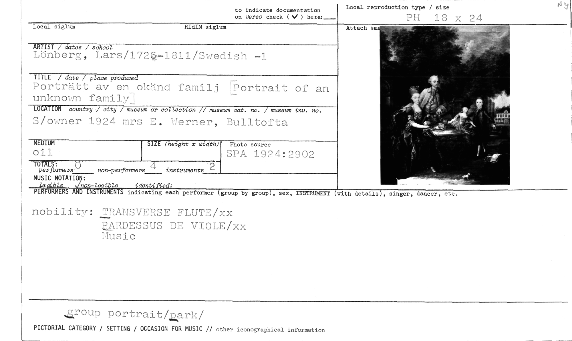 //// to indicate documentation on verso check ( ) here: //// Local reproduction type / size //// PH 13 : 24 //// Local siglum //// Attach s //// RIdIM siglum //// ARTIST / dates / school //// Ujnber9 Lars/172=1811/Swedish -1 //// TITLE / date / place produced //// Portritt av en okänd familj Portrait of an unknown family-» //// LOCATION country / city / museum or collection // museum cat. no. / museum inv. no. //// S/owner 1924 mrs E. Werner, Bulltofta //// MEDIUM //// 011 //// SIZE (height x brtdth) //// TOTALS: //// per formers ' non-performers instruments //// MUSIC NOTATION: //// lecible Jnon-leaible identiMd: //// PERFORMERS AND INSTRUMENTS indicating each performer (group by group), sex, INSTRUMENT //// nobility: TRARSVERSE FLUTE/xx //// PARDESSUS DE VIOLE/xx Music //// (with details), singer, dancer, etc. //// group pOrtrait4Zp.rk/ //// PICTORIAL CATEGORY / SETTING / OCCASION FOR MUSIC // other iconographical information ////