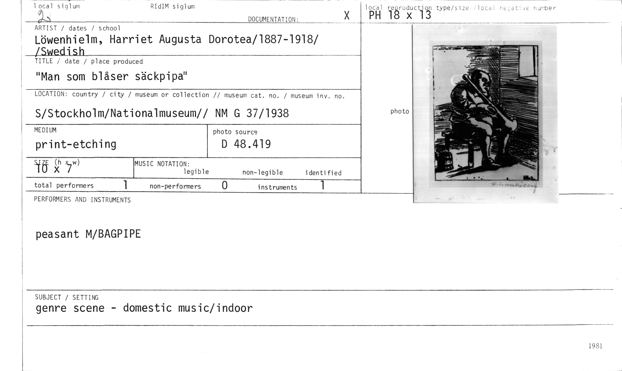 //// 1 ocal siglum RIdIM siglum //// DOCUMENTATION: //// X1PHlrirg(Tibi type/size loc I:Hve number //// ARTIST / dates / school //// Löwenhielm, Harriet Augusta Dorotea/1887-1918/ //// /Swedish //// TITLE / date / place produced //// "Man som blåser säckpipa" //// LOCATION: country / city museum or collection // museum cat. no. / museum inv. no. //// S/Stockholm/Nationalmuseum// NM G 37/1938 //// MEDIUM //// print-etching //// MUSIC NOTATION: //// legible non-legible identified //// stefX 7w) //// photo source //// D 48.419 //// photo //// total performers 1 non-performers 0 instruments 1 //// PERFORMERS AND INSTRUMENTS //// peasant M/BAGPIPE //// SUBJECT / SETTING //// genre scene - domestic music/indoor //// 1981 ////