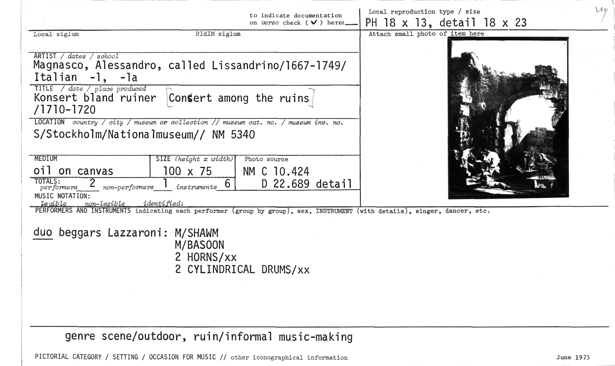 //// Local reproduction type / size //// to indicate documentation //// on verso check (V) here:__-- PH 18 x 13, detail 18 x 23 //// Attach small photo of item here //// Local siglum RIdIM siglum //// TITLE / date / place produced //// Konsert bland ruiner ConCert among the ruins /1710-1720 //// LOCATION country / city / museum or collection // museum aut. no. / museum tnv. no. //// S/Stockholm/Nationalmuseum// NM 5340 //// SIZE (height x width) //// 100 x 75 //// TOTALS: //// per formers 2 non-performers 1 instruments 6 MUSIC NOTATION: //// non-legible //// (group by group), sex, INSTRUMENT //// PERFORMERS AND INSTRUMENTS indicating each performer //// duo beggars Lazzaroni: M/SHAWM //// M/BASOON //// 2 HORNS/xx //// 2 CYLINDRICAL DRUMS/xx //// ARTIST / dates / school //// Magnasco, Alessandro, called Lissandrino/1667-1749/ Italian -1, -la //// MEDIUM //// oil on canvas //// NM C 10.424 //// D 22.689 detail //// Photo source //// (with details), singer, dancer, //// etc. //// genre scene/outdoor, ruin/informal music-making //// PICTORIAL CATEGORY / SETTING / OCCASION FOR MUSIC // other iconographical information //// June 1975 ////