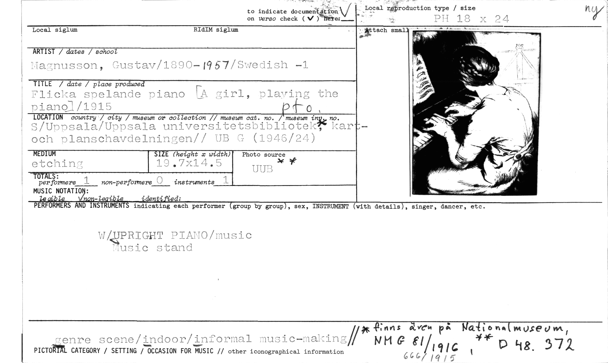 //// roduction type / size //// PH 18 x 24 //// jtach smal //// to indicate documenlation \4/( //// on verso check ( fbek'ye:_ //// Local siglum RIdIM siglum //// ARTIST / dates / school //// Magnusson, Gustav/1b90-1957/Swedish -1 //// TITLE / date / place produced //// Flicka spelande piano FA girl, planing the piano]. /1915 P 4-- 0 //// LOCATION country' city / museum or collection // museum cat. no. / museum in //// S/Uppsala/Uppsala universitetsbibliotek, kar och planschavdelningen// UB G (1946/24) //// MEDIUM SIZE (height x width) //// etching 19.7x14.5 //// Crrperformers 1 non-performers 0 instruments //// MUSIC NOTATIOU: //// lfcible Ninon-leaible identified: //// PERFORMERS AND INSTRUMENTS indicating each performer (group by group), sex, INSTRUMENT (with details), singer, dancer, etc. //// \/,j7PRIGHT PIANO/music 7u sic stand //// fif-Knels Na.-Görl«lmuseowt //// yyenre scene/indoor/informal music-malning p 6,1 i 44- //// PICTORTAL CATEGORY / SETTING i7CCASION FOR MUSIC // other iconographical information /191C P tig. 37Z //// Photo source //// UUB ////