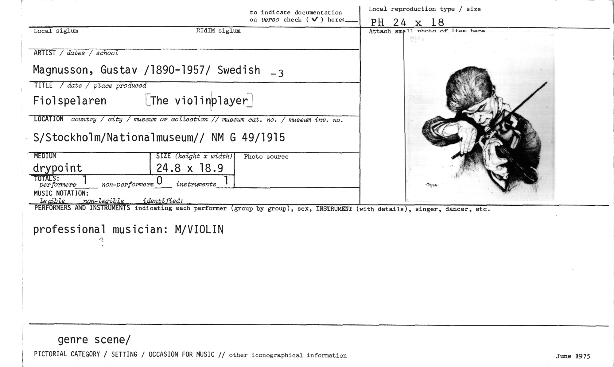 //// to indicate documentation //// on verso check ( %1 ) here:._ //// Local reproduction type / size //// PH 24 x 18 //// Local siglum RIdIM siglum Attach sm il nh~ nf it.rn here //// ARTIST / dates / school //// TITLE / date / place produced //// Fiolspelaren _The violinplayer //// MUSIC NOTATION: //// le a,ble non-leaible idntifted: //// PERFORMERS AND INSTRUMENTS indicating each performer (group //// professional musician: M/VIOLIN //// by group), sex, INSTRUMENT (with details , singer, dancer, etc. //// drypoint 24.8 x 18.9 //// Trks, //// per formers 1 non-performers ° instruments 1 //// Magnusson, Gustav /1890-1957/ Swedish _ //// LOCATION country / city / museum or collection // museum cat. no. / museum inv. no. //// S/Stockholm/Nationalmuseum// NM G 49/1915 //// MEDIUM SIZE (hetght x width) Photo source //// genre scene/ //// PICTORIAL CATEGORY / SETTING / OCCASION FOR MUSIC // other iconographical information June 1975 ////