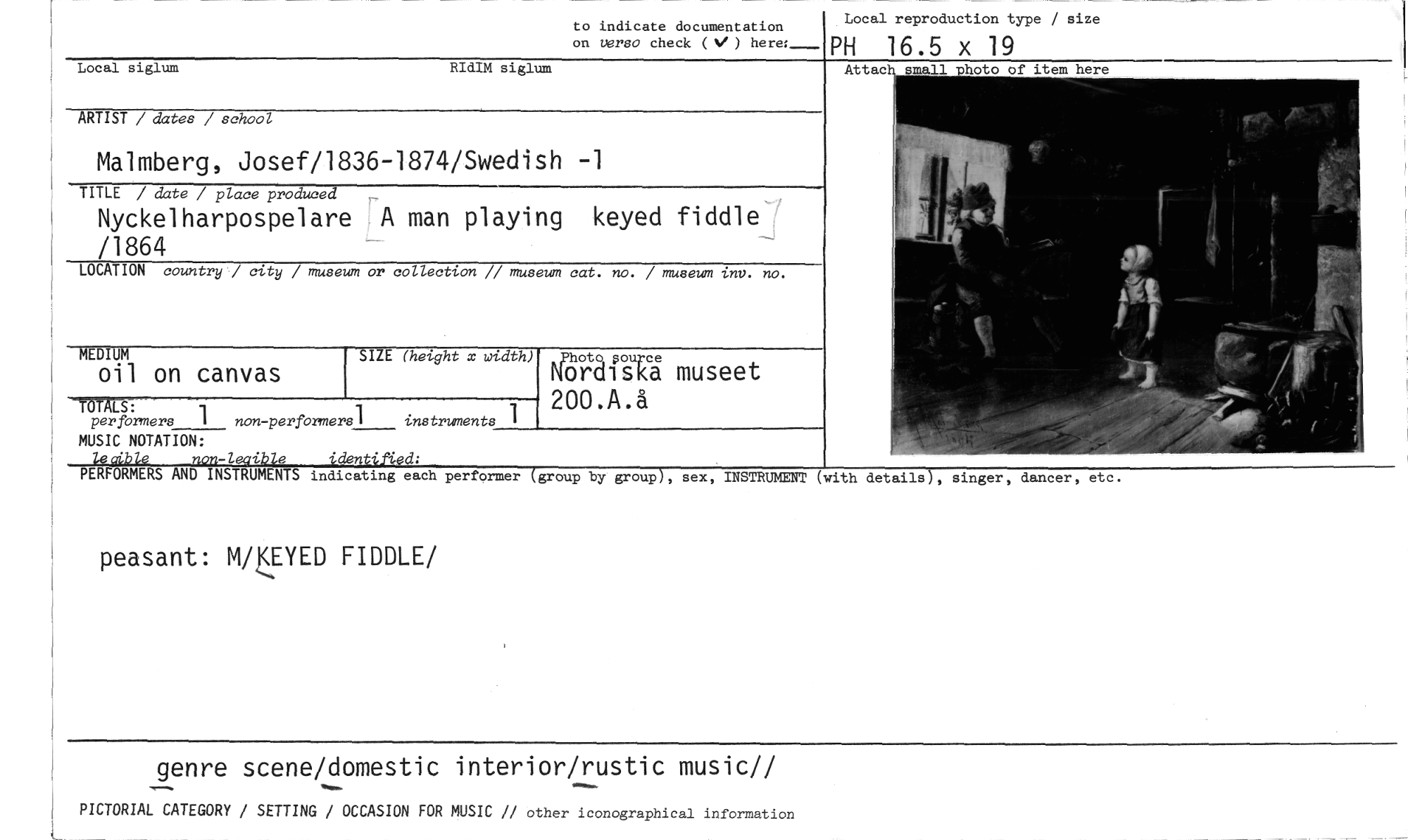 //// to indicate documentation //// on versa check (V ) here:- //// Local reproduction type / size //// PH 16.5 x 19 //// ARTIST / dates / school //// Malmberg, Josef/1836-1874/Swedish -1 //// TITLE / date / place produced //// Nyckelharpospelare A man playing keyed fiddle /1864 //// LOCATION country / city / museum or collection // museum cat. no. / museum inv. no. //// SIZE (hetght x width) //// TOTALS: //// perfbrmers 1 non-performers] instruments 1 //// MUSIC NOTATION: //// -1-g• g e •dent • d; //// PERFORMERS AND INSTRUMENTS indicating each pertormer //// peasant: M/UYED FIDDLE/ //// genre scene/domestic interior/rustic music// //// Local siglum RIdIM siglum //// Attac //// MEDIUM //// oil on canvas //// hota museet //// 200.A.å //// group by group , sex, INSTRUMENT (with details), s nger, dancer, etc. //// PICTORIAL CATEGORY / SETTING / OCCASION FOR MUSIC // other iconographical information ////