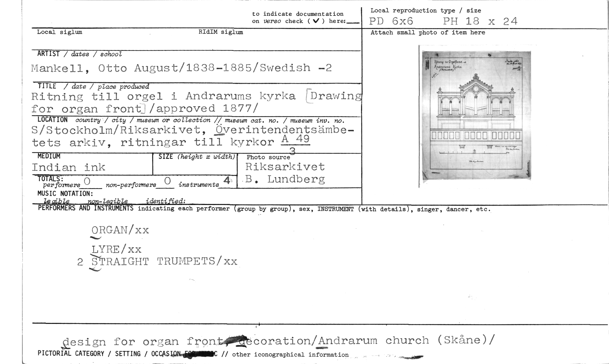 //// to indicate documentation on verso check (V ) here: //// Local reproduction type / size //// PD 6x6 PH 18 x 24 //// Local siglum RIdIM siglum //// ARTIST / dates / school //// Manken., Otto August/1838-1885/Swedish -2 //// TITLE / date / place produced //// Ritning till orgel i Andrarums kyrka Lprawing for organ frontl/approved 1877/ //// Attach small photo of item here //// LOCATION country / city / museum or collection // museum cat. no. / museum inv. no. //// S/Stockholm/Riksarkivet, Overintendentsämbetets arkiv, ritningar till kyrkor A 49 //// MEDIUM SIZE (height x width) Photo source3 //// Indian ink Riksarkivet //// B. Lundberg //// TOTAS: //// perfbrme PS non-performers ° instruments 4 //// MUSIC NOTATION: //// leoible non-lecibie identilied; //// PERFORMERS AND INSTRUMENTS indicating each performer (group by group), sex, INSTRUMENT (with details), singer, dancer, etc. //// ORGAN/xx //// LYRE/xx //// 2 'n'RAIGHT TRUMPETS/xx //// design for organ front40"Coration/Andrarum church (Skåne)/ //// PICTORIAL CATEGORY / SETTING / OCCASILI~C // other iconographical information.,. ////