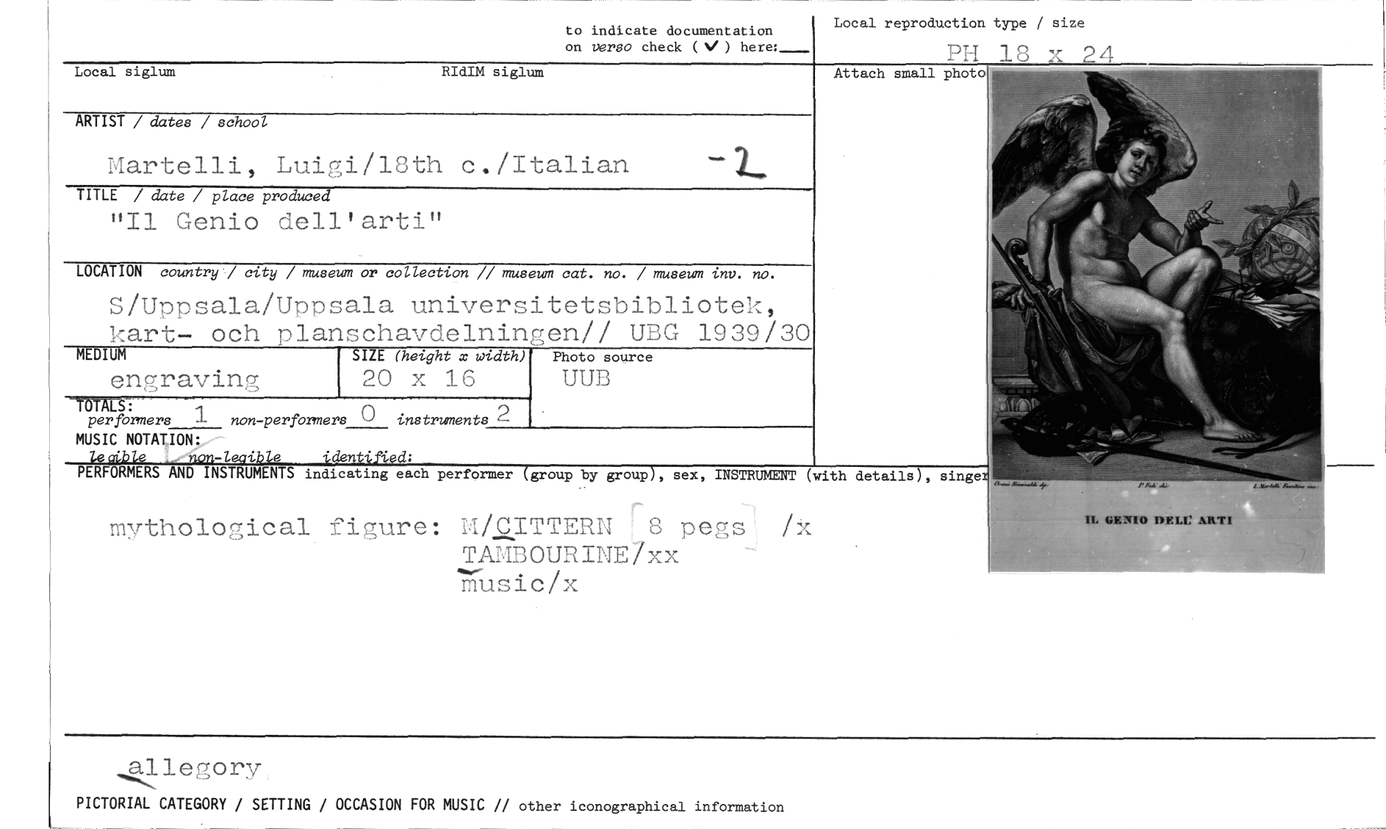 //// to indicate documentation //// on verso check ( V ) here: //// Local siglum RIdIM siglum //// ARTIST / dater / school Local reproduotion type / size //// PH 18 , 24 //// tach small photo //// Martelli, Luigi/l8th c./Italian //// TITLE / date / place produced //// "Il Genio dell'arti" //// LOCATION country / city / museum or collection // museum cat. no. / museum inv. no. //// S/Uppsala/Uppsala universitetsbibliotek, kart- och planschavdelningen// UBG 1939/30 //// MEDIUM SIZE (height x width) Photo source //// engraving 20 x 16 UUB //// e '1 : //// per formers 1 non-performerm () instruments 2 //// MUSIC NOTATION: //// i 'de d: //// RMERS AND indicating each performer (group by group), sex, INSTRUMENT (with details), Binge_ //// mythological figure: M/CITTERN n8 pegs /X //// TAMOURINE/xx //// 15ilsic/x //// PE //// ' I //// INS RUM NT //// ILGEYMDELC.XWFI //// allegorv //// - //// PICTORIAL CATEGORY / SETTING / OCCASION FOR MUSIC // other iconographical information ////