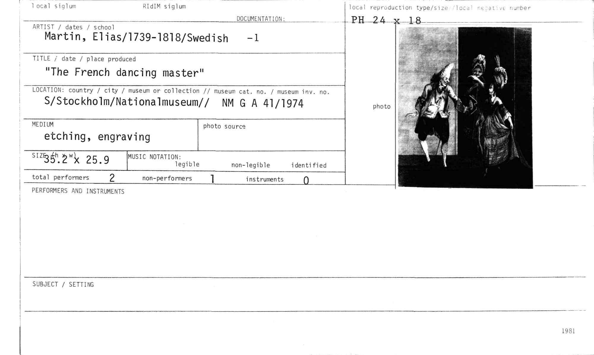 //// 1 otal siglum RIdIM siglum DOCUMENTATION: //// ARTIST / dates / school //// Martin, Elias/1739-1818/Swedish —1 //// TITLE / date / place produced //// "The French dancing master" //// LOCATION: country / city / museum or collection // museum cat. no. / museum inv. no. //// S/Stockholm/Nationalmuseum// NM G A 41/1974 //// MEDIUM photo source //// etching, engraving //// SIZE),[ukv( 25.9 MUSIC NOTATION: //// legible non-legible identified //// total performers 2 non-performers 1 instruments n //// lotal reproduction type/size lotal ne2at ve number //// P kl_2_4_ 1-B //// PERFORMERS AND INSTRUMENTS //// SUBJECT / SETTING //// 1981 ////