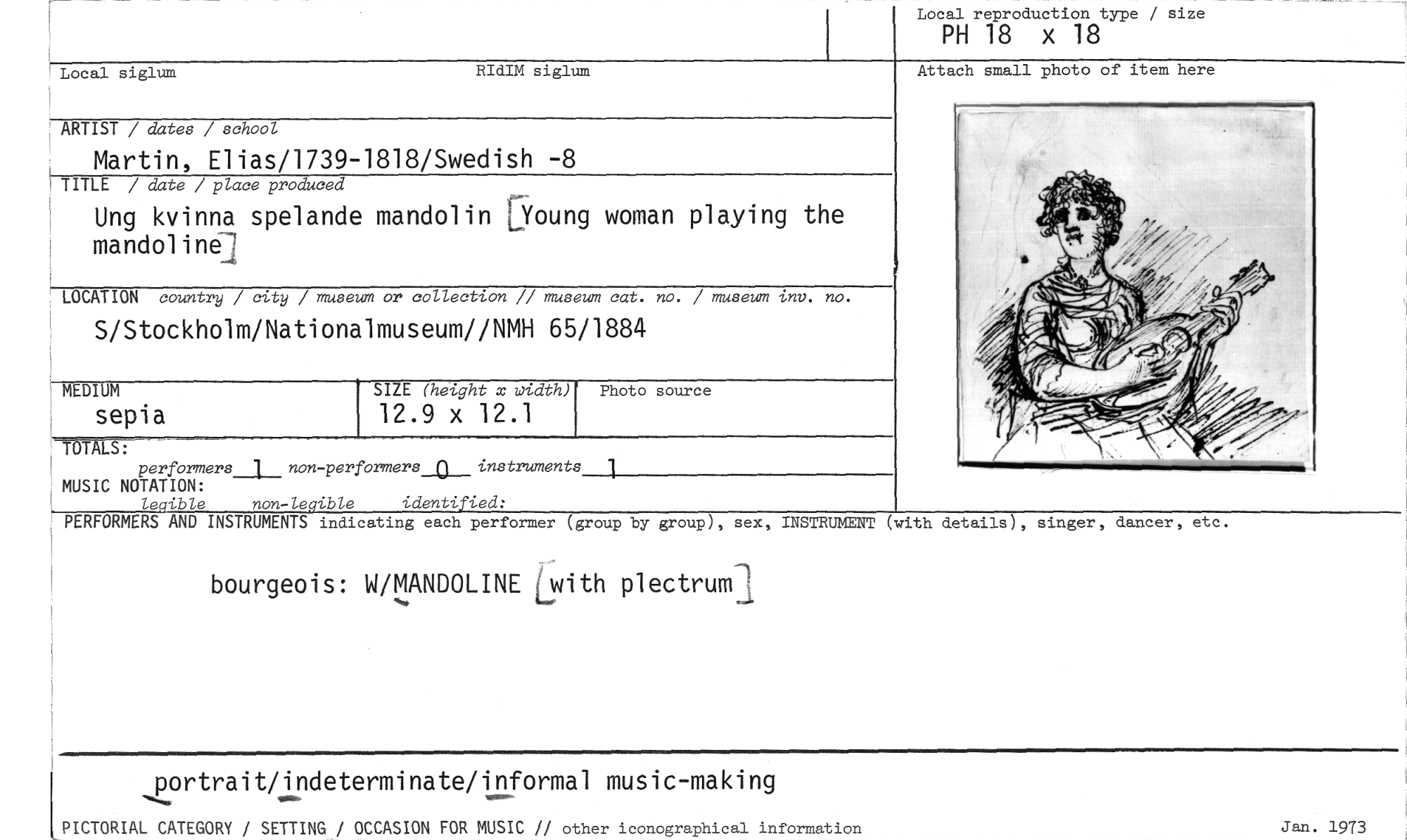 //// Local reproduction type / size //// PH 18 x 18 //// ARTIST / dates / school //// Martin, Elias/1739-1818/Swedish -8 //// TITLE / date / place produced //// Ung kvinna spelande mandolin [Young woman playing the mandolin61 //// LOCATION country / city / museum or collection // museum cat. no. / museum inv. no. //// S/Stockholm/Nationalmuseum//NMH 65/1884 //// Photo source //// T T LS: //// performers__1__ non -performers_a__ instruments 1 MUSIC NOTATION: //// Zegible non-legible identified: //// MEDIUM //// sepia //// SIZE (height x width) 12.9 x 12.1 //// Attach small photo of item here //// Local siglum RIdIM siglum //// PERFORMERS AND INSTRUMENTS indicating each performer (group by group), sex, INSTRUMENT (with details), singer, dancer, etc. //// bourgeois: W/MANDOLINE with plectruml //// portrait/indeterminate/informal music-making //// wa //// [ PICTORIAL CATEGORY / SETTING / OCCASION FOR MUSIC // other iconographical information Jan. 1973 ////