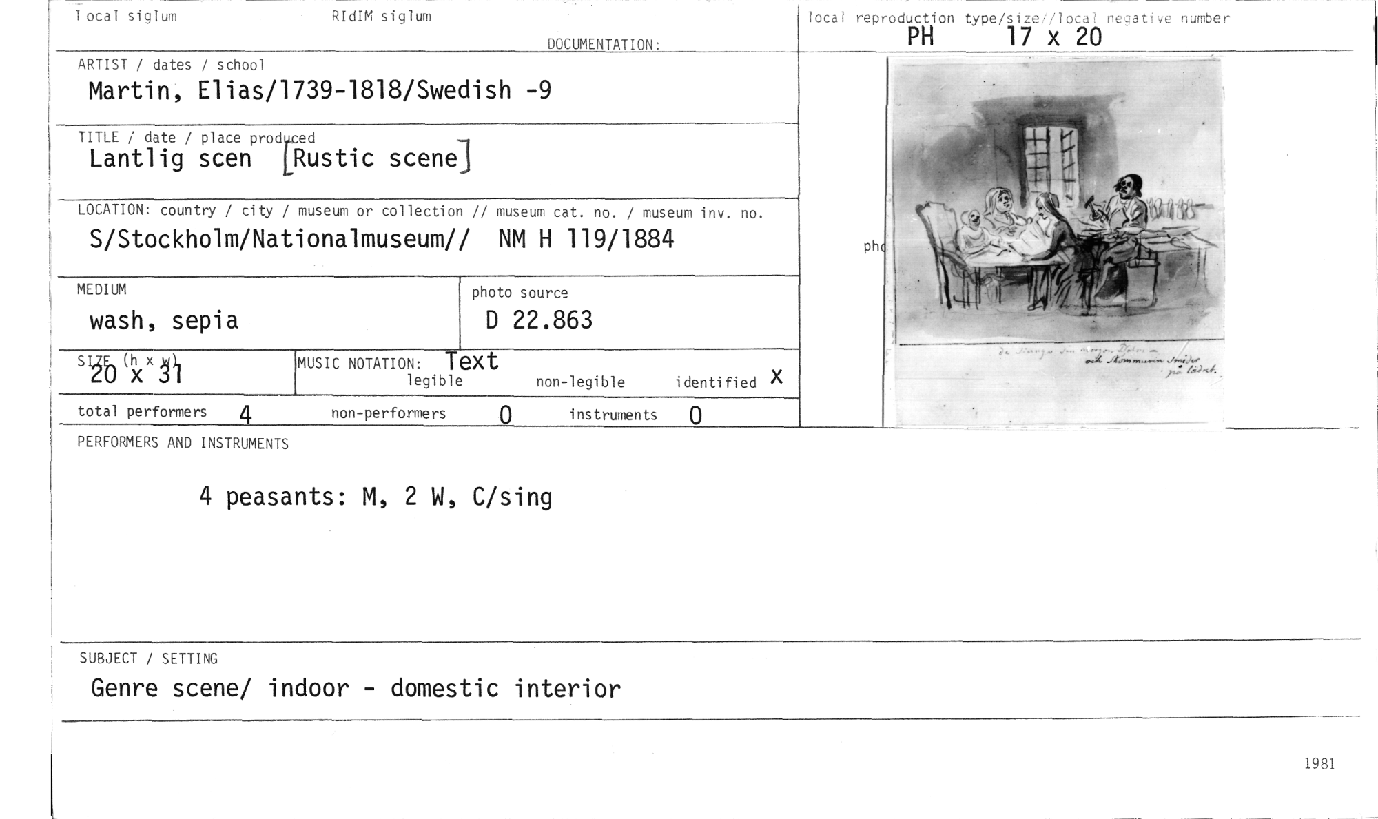 //// SUBJECT / SETTING //// Genre scene/ indoor - domestic interior //// r //// 1 ocal siglum RIdIM siglum //// lotal reproduPHction type/sizernocal ne;ative nutuber //// 17 x 20 //// DOCUMENTATION: //// 739-1818/Swedish -9 //// ARTIST / dates / school //// Martin, Elias/1 //// LOCATION: country / city / //// S/Stockholm/Nat //// ionalmuseum// NM H 119/1884 //// museum or collection // museum cat. no. / museum inv. no. //// i den ti fi ed X //// MUSIC NOTATION: Text //// legible non-legible //// 0 //// 4 //// 0 //// instruments //// non-performers //// total performers //// TITLE / date / place prodred //// Lantlig scen Rustic scene] //// MEDIUM //// wash, sepia //// slävj), //// photo source //// D 22.863 //// PERFORMERS AND INSTRUMENTS //// 4 peasants: M, 2 W, C/sing //// phc //// 1981 ////
