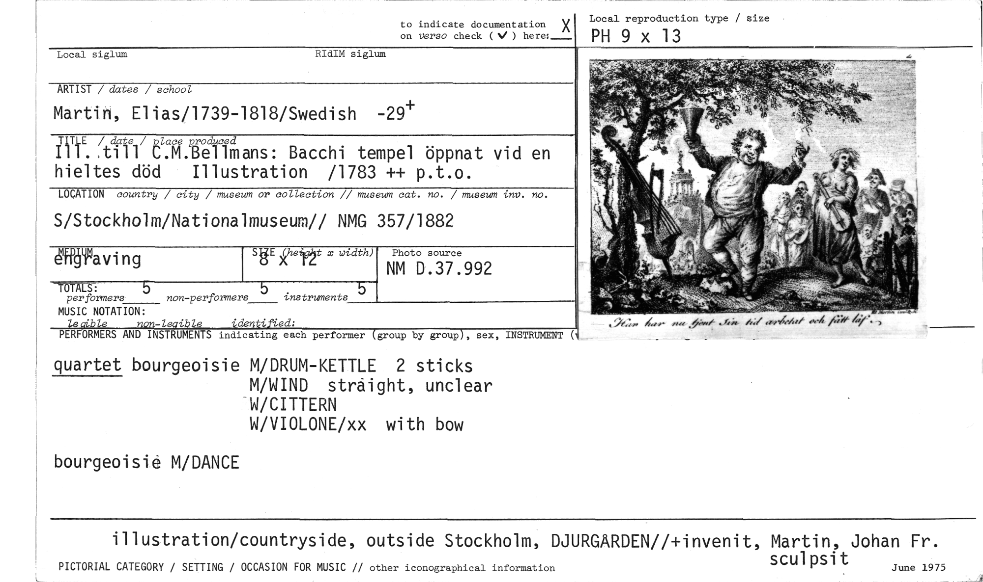 //// to indicate documentation X on verso check (Ni ) here: Local reproduction type / size //// PH 9 x 13 //// //// Local siglum RIdIM siglum //// ARTIST / dates / school //// Martin, Elias/1739-1818/Swedish -29+ //// WIE / date / place produced //// Ill.,till C.M.Bellmans: Bacchi tempel öppnat vid en hieltes död Illustration /1783 ++ p.t.o. //// LOCATION country / city / museum or collection // museum cat. no. / museum inv. no. //// S/Stockholm/Nationalmuseum// NMG 357/1882 //// 4Hbfaving säEpt2t x width) Photo source //// NM D.37.992 //// //// TÖTALS: 5 //// per formers non-parformers instruments //// MUSIC NOTATION: //// led.b/e non-leorible Cdentified: //// PERFORMERS AND INSTRUMENTS indicating each performer (group by group), sex, INSTRUMENT //// quartet bourgeoisie M/DRUM-KETTLE 2 sticks //// M/WIND sträight, unclear W/CITTERN //// W/VIOLONE/xx with bow //// bourgeoisi M/DANCE //// «,,,r(e/a, 6;;*, , //// illustration/countryside, outside Stockholm, DJURGARDEN//+invenit, Martin, Johan Fr. //// sculpsit //// PICTORIAL CATEGORY / SETTING / OCCASION FOR MUSIC // other iconographical information //// June 1975 ////