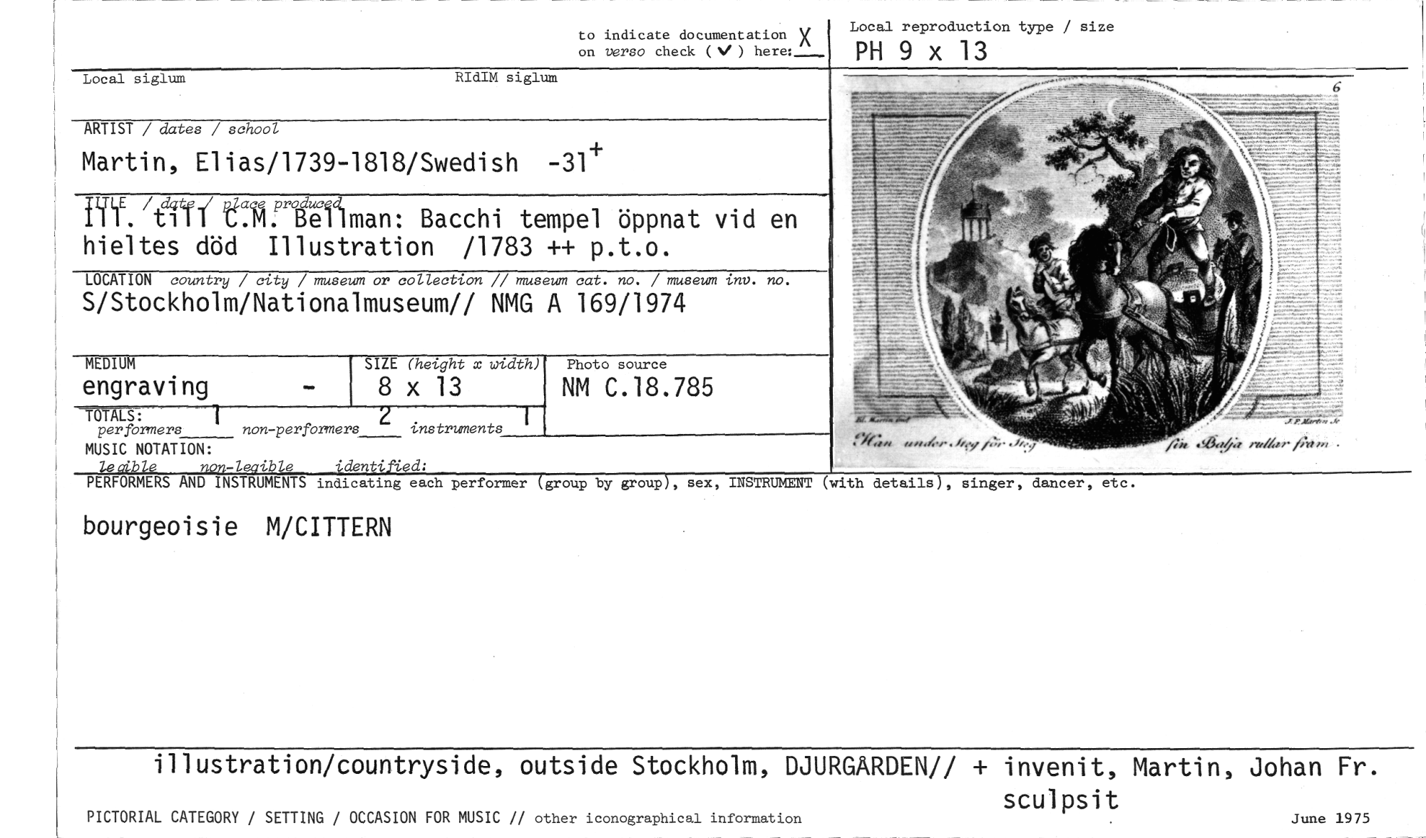 //// to indicate documentation X on verso check (NI ) //// Local reproduction type / size //// PH 9 x 13 //// Local siglum RIdIM siglum //// ARTIST / dates / school //// Martin, Elias/1739-1818/Swedish -31+ //// PC1E. /-6'41' Bacchi tempel öppnat vid en //// hieltes död Illustration /1783 ++ p.t.o. //// LOCATION country / city / museum or collection // museum cat. no. / museum inv. no. //// S/Stockholm/Nationalmuseum// NMG A 169/1974 //// MEDIUM //// engraving //// SIZE (height x width) //// 8 x 13 //// Photo source //// NM C.18.785 //// 2 1 //// per formers non-performers instruments //// rw/b,./A7 . //// MUSIC NOTATION: //// Zecnble non-leoible identified; //// PERFORMERS AND INSTRUMENTS indicating each performer (group by group), sex, INSTRUMENT //// (with details), singer, dancer, etc. //// bourgeoisie M/CITTERN //// illustration/countryside, outside Stockholm, DJURGARDEN// + invenit, Martin, Johan Fr. //// sculpsit //// June 1975 //// PICTORIAL CATEGORY / SETTING / OCCASION FOR MUSIC // other iconographical information ////