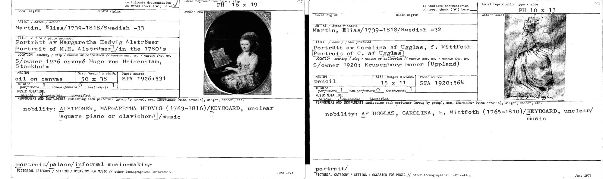 //// TITLE / date / place produced //// Torträtt av Margaretha. Hedvig Alströmer Portrait of M.H. Alströmein the 1780's //// MEDIUM //// oil on canvas //// MUSIC NOTATIO Zeoible -leaible identified; PERFORMERS AND INSTRUMENTS indicating each performer (group by group), sex, INSTRUMENT (with details), singer, dancer, etc. //// nobility: ALSTRöMER, MARGARETHA HEDVIG (1763 -1816)/KEYBOARD, unclear 'square piano or clavichord /music //// non-perfbr () ners instruments 1 //// SIZE (hetght x width) //// 50 x 38 //// Photo source //// SPA 1926:531 //// -TOTALS: //// per formers 1 //// Attach sma //// ARTIST / dates / school //// Martin, Elias/1739-1818/Swedish —33 //// LOCATION country / city / museum or collection // museum cat. no. / museum inv. no. //// S/owner 1926 envoy6 Hugo von Heidenstam, Stockholm //// Local reproduction ty / sigp //// PHyp 16 x 19 //// to indicate documentation //// on verso check ( ) here: Ni //// Local siglum RIdIM siglum //// to indicate documentation on verso check ( ) Local reproduction type / size //// PH 10 x 13 //// //// Local siglum RIdIM siglum //// ARTIST / dates g'school //// Martin Elias/1739-1818/Swedish -32 //// TITLE / date / place produced //// Porträtt av Carblina af Ugglas, f. Wittfoth //// -17ortrait //// of C. af UgglaS2 //// LOCATION country / city / museum or collection // museum cat. no. / museum inv. no. //// S/owner 1920: Krusenberg manor (Uppland) //// MEDIUM SIZE (height x width) Photo source //// pencil 15 x 11 SPA 1920:564 //// //// -ToTALs: //// per formers 1 non-perfbrmers () instruments //// MUSIC NOTATIO : //// -leaible identif4ed: //// PERFORMERS D INSTRUMENTS indicating each performer (group by group), sex, INSTRUMENT (with details), singer, dancer, etc. //// nobility: AF UGGLAS, CAROLINA, b. Wittfoth (1765-1810)/KEYBOARD, unclear/ -- music //// portrait/palace/informal music-making portrait/ June 1975 //// PICTORIAL CATEGORY/ SETTING / OCCASION FOR MUSIC // other iconographical information June 1975 151CTORIAL CATEGORY / SETTING / OCCASION FOR MUSIC // other iconographical information ////