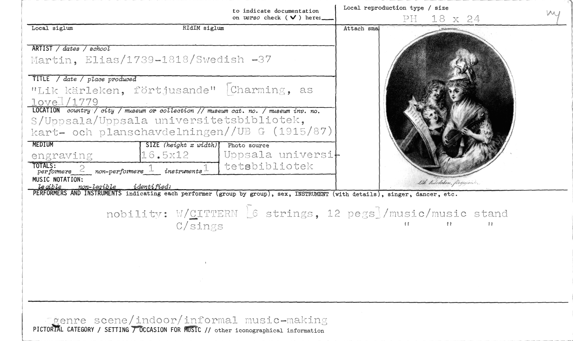//// to indicate documentation //// on verso check (V) here:--- //// Local reproduction type / size //// 18 x 24 //// Local siglum RIdIM siglum //// ARTIST / dates / school //// Martin, Elias/1739-1318/Swedish -37 //// TITLE / date / place produced //// "Lik kärleken, förtjusande" Charming, as love)/1779 //// LOCATION country" city / museum or collection // museum cat. no. / museum inv. no. //// S/Uppsala/Uopsala universitetsbibliotek, kart- och planschavdelningen//UB G (1915/87) //// MEDIUM //// engraving //// MUSIC NOTATION: //// PERFORMERS AND INSTRUMENTS indicating each performer (group by group), sex, //// nop-/ecriZe //// INSTRUMENT (with details , singer, dancer, etc. //// nobilitv: W/CITTERN ,6 strings, 12 pegs-9music/music stand C/sings i t //// ,genre scene/indoor/informal music-making //// PICTORTÅL CATEGORY / SETTINGTTCCASION FOR MIM // other iconographical information //// TOTALS: //// per formera 2 non-performers 1 instruwents //// SIZE (height x width) //// 16.5x12 //// Photo source //// Uppsala universitetsbibliotek //// Attach s ////