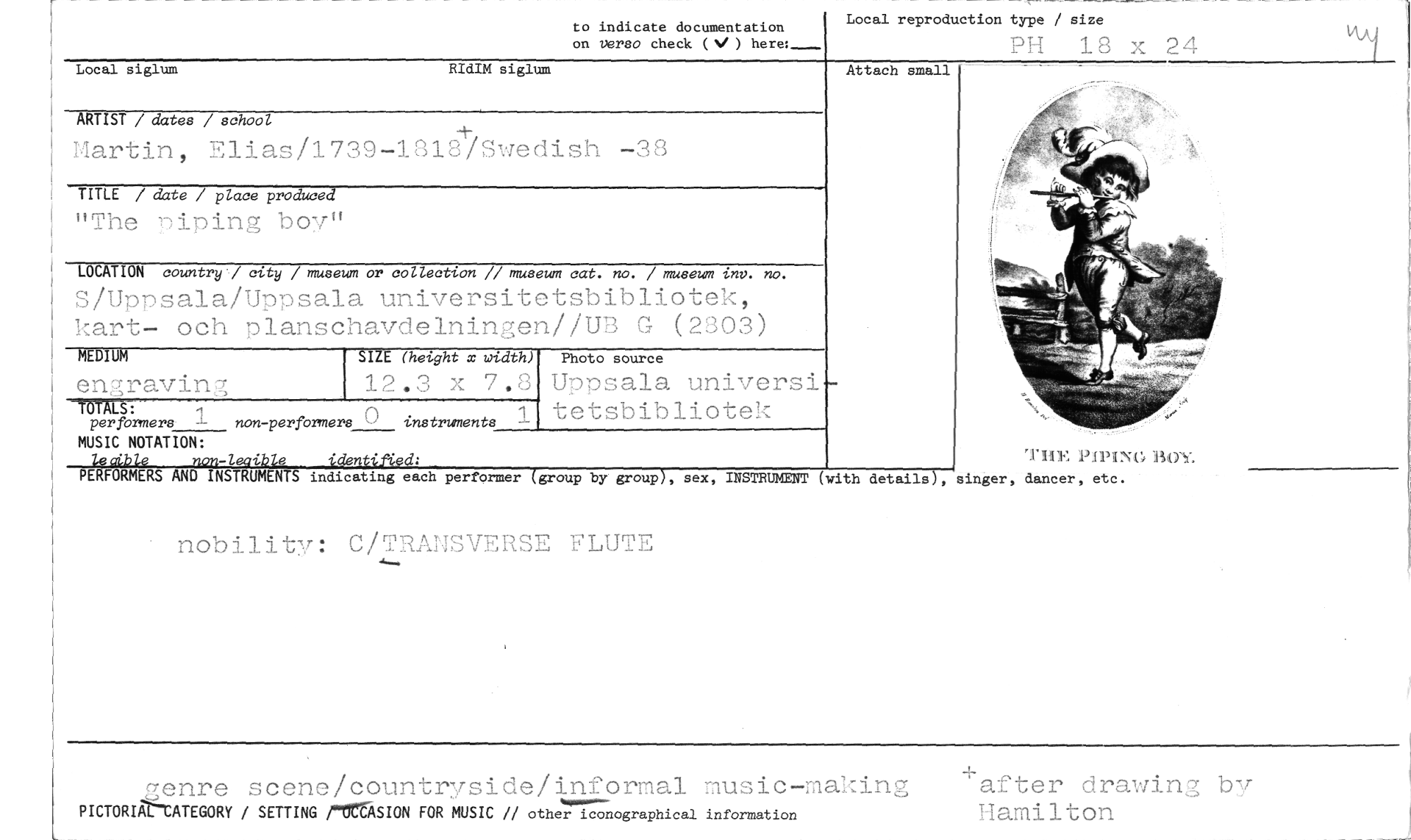 //// to indicate documentation //// on versa check (V) here:..--- //// Local reproduction type / size //// 1H 18 x 24 //// Attach small //// ARTIST / dater / school //// Martin, Elias/1739-1218/Swedish -38 //// TITLE / date / place produced //// "The nioing boy" //// LOCATION country'/ city / museum or collection // museum cat. no. / museum tnv. no. //// S/Uppsala/Uppsala universitetsbibliotek, kart- och planschavdelningen//UB G (2303) //// D //// engraving //// =ALS: //// per formers 1 non-perfbrmers 0 instruments //// MUSIC NOTATION: //// • -lecible identiff,ed: //// PERFORMERS AND NSTRUMENTS indicating each performer (group by //// nobility: C/TRANSVERSE FLUTE //// genre scene/countryside/informal music-making +after drawing bv Hamilton //// PICTORat-CATEGORY / SETTING rttaSION FOR MUSIC // other iconographical information //// I E (height x width //// 12.3 x 7. //// 1 //// Photo source //// Uppsala universi tetsbibliotek //// BOY. //// group), sex, INSTRUMENT (with detalls), Ginger, dancer, etc. //// Local siglum RIdIM siglum ////