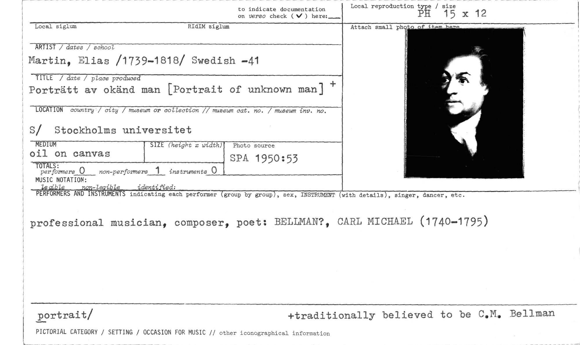 //// to indicate documentation //// on versa check (V ) here;. //// Local reproduction type / size //// PH 15 x 12 //// Local siglum RIdIM siglum //// ARTIST / dates / school //// Martin, Elias /1739-1818/ Swedish —41 //// TITLE / date / place produced //// Porträtt av okänd man [Portrait of unknown man] //// LOCATION country / city / museum or collection // museum cat. no. / museum tnv. no. //// S/ Stockholms universitet //// MEDIUM SIZE (height x width) Photo source :53 //// oil on canvas SPA 1950 //// TOTAS: non-performers 1 instruments 0 //// per formers 0 //// MUSIC NOTATION: • 9 e 'den ' ied: //// •.( e //// Attach small ph //// PE FORMERS AND INST //// UMENTS indicating //// each per former (group by group), sex, INSTRUMENT (with details), singer, dance etc. //// professional musician, composer, poet: BELLMAN?, CARL MICHAEL (1740-1795) //// portrait/ +traditionally believed to be C.M. Bellman //// PICTORIAL CATEGORY / SETTING / OCCASION FOR MUSIC // other iconographical information ////
