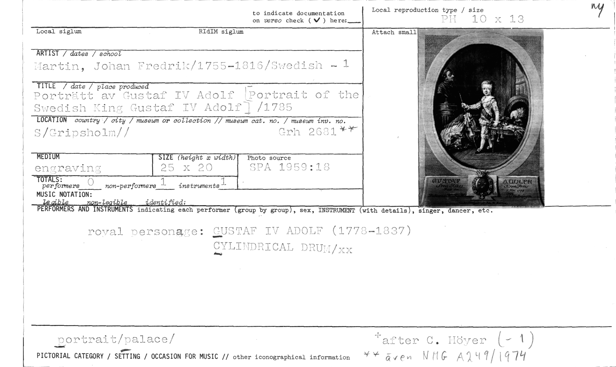 //// royal nersongge: GUSTAF IV ADOLF (1778-1837) CYLINDRICAL DRUM/xx //// portrait/palace/ safter C. libyer (- i) //// PICTORIAL CATEGORY / SETTING / OCCASION FOR MUSIC // other iconographical information NriG A191 / //// Attach small //// Local siglum RIdIM siglum //// to indicate documentation //// on versa check (V ) here:___ //// Local reproduction type / size //// 1 fl 10 x 13 //// ARTIST / dates / school //// Ifartin, Johan Fredrik/1755-1816/Swedish //// TITLE / date / place produced //// Porträtt av Gustaf IV Adolf Lportrait of the Swedish Ming Gustaf IV Adolfj /1785 //// LOCATION country] city / museum or collection // museum cat. no. / museum inv. no. //// S/Gripsholm// Grh 26314-1' //// MEDIUM //// engraving //// SIZE (height x width) //// 25 x 20 //// Photo source //// SIDA 1959:18 //// TOTALS: //// per formers non-perfbrmers 1 instruments //// MUSIC NOTATION: //// leciblp nen-leigib& identified: //// PERFORMERS AND INSTRUMENTS indicating each performer (group by group), sex, INSTRUMENT (with details), s nger, etc. ////