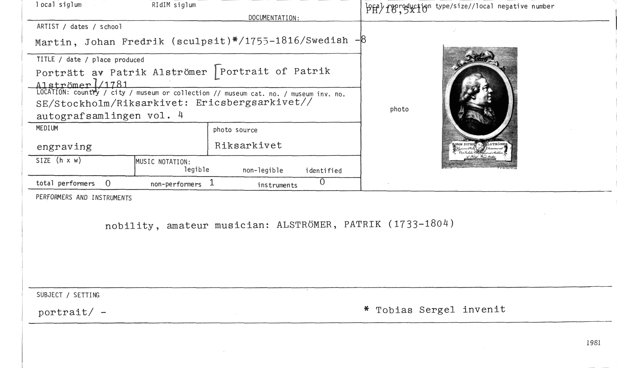 //// local siglum RIdIM siglum //// ifflayrelMtIlln type/size//local negative number //// DOCUMENTATION. //// ARTIST / dates / school //// Martin, Johan Fredrik (sculpsit)*/1755-1816/Swedish -8 //// TITLE / date / place produced //// Porträtt av Patrik Alströmer [Portrast of Patrik AlgttrömeT17R1 //// LOCATION: country / city / museum or collection // museum cat. no. / museum inv. no. //// SE/Stockholm/Riksarkivet: Ericsbergsarkivet// autografsamlingen vol. 4 //// MEDIUM photo source //// engraving Riksarkivet //// SIZE (h x w) MUSIC NOTATION: non-legible identified //// legible //// total performers 0 non-performers 1 instruments 0 //// PERFORMERS AND INSTRUMENTS //// photo //// nobility, amateur musician: ALSTRÖMER, PATRIK (1733-1804) //// SUBJECT / SETTING * Tobias Sergel invenit //// portrait/ — //// 1981 ////