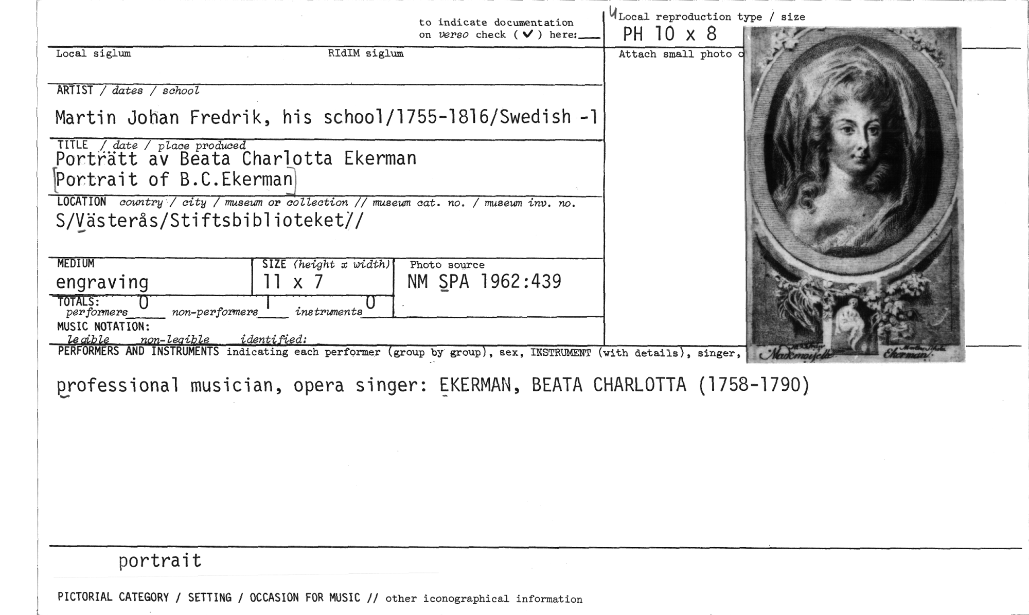 //// to indicate documentation on Vers(' check (V ) here: //// 4Local reproduction type / size //// PH 10 x 8 //// Local siglum RIdIM siglum //// Attach small photo c //// ARTIST / dates / school //// Martin Johan Fredrik, his school/1755-1816/Swedish -1 //// TITLE t date / place produced //// Porträtt av Beata Charlotta Ekerman IPortrait of B.C.Ekermanj //// LOCATION country / city / museum or collection // museum cat. no. / museum inv. no. //// S/Västerås/Stiftsbiblioteket// //// MEDIUM //// engraving //// Photo source //// SIZE (height x width) //// il x 7 //// NM SPA 1962:439 //// TOTALS: 1 //// per formers non-performers instruments //// MUSIC NOTATION: //// ••i-1-•i• //// 'den '-d: //// PERFORMERS AND INSTRUMENTS indicating each performer (group by group), sex, INSTRUMENT (with details), singer, //// professional musician, opera singer: EKERMAN, BEATA CHARLOTTA (1758-1790) //// portrait //// PICTORIAL CATEGORY / SETTING / OCCASION FOR MUSIC // other iconographical information ////