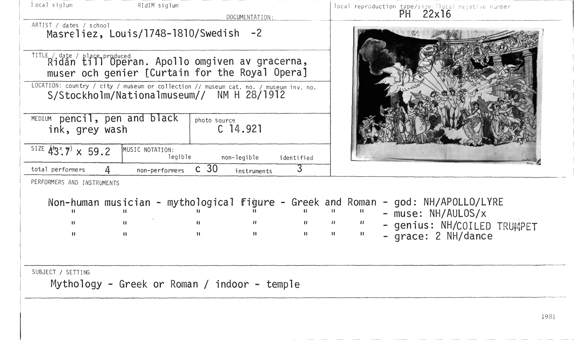 //// PERFORMERS AND INSTRUMENTS mythological figure Greek and Roman - god: NH/APOLLO/LYRE //// Non-human musician - muse: NH/AULOS/x //// II II //// - genius: NH/COILED TRUMPET //// - grace: 2 NH/dance //// SUBJECT / SETTING //// Mythology - Greek or Roman / indoor - temple //// '-e number //// local reproduction type/size //// PH 22x16 //// RIdIM siglum //// 1 ocal siglum //// DOCUMENTATION: //// ARTIST / dates / school //// Masreliez, Louis/1748-1810/Swedish -2 //// TITLE /.d ge / olpce praduced //// Ridan till Operan. Apollo omgiven av gracerna, //// muser och genier [Curtain for the Royal Opera] //// LOCATION: country / city / museum or collection // museum cat. no. / museum inv. no. //// S/Stockholm/Nationalmuseum// NM H 28/1912 //// MEDIUM pencil, pen and black ink, grey wash //// photo source //// C 14.921 //// SIZE . //// i.)/ X 59.2 //// total performers 4 non-per-formers C 30 //// instruments //// 3 //// -.7 //// MUSIC NOTATION: //// legible non-legible identified //// 1981 ////