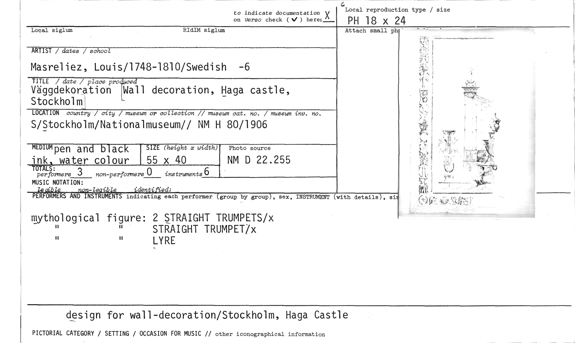 //// to indicate documentation //// Local reproduction type / size //// on verso check (•/) here: y2_ PH 18 x 24 //// Local siglum RIdIM siglum //// ARTIST / dates / school //// Masreliez, Louis/1748-1810/Swedish -6 //// te //// TITLE / date / place pro ed //// Väggdekoration Wall decoration, Haga castle, Stockholm: //// LOCATION country / city / museum or collection // museum cat. no. / museum Inv. no. //// S/Stockholm/Nationalmuseum// NM H 80/1906 //// SIZE (height x width) //// 55 x 40 //// MUSIC NOTATION: //// lecible non-leaible identified; //// PERFORMERS AND INSTRUMENTS indicating each performer (group by group), //// mythological figure: 2 STRAIGHT TRUMPETS/x //// STRAIGHT TRUMPET/x LYRE //// MEDIUM pen and black //// ink water colour //// per formers J non-perfoinners 0 instruments //// Photo source //// NM D 22.255 //// Attach small p //// sex, INSTRUMENT (with details), si //// design for wall-decoration/Stockholm, Haga Castle //// PICTORIAL CATEGORY / SETTING / OCCASION FOR MUSIC // other iconographical information ////