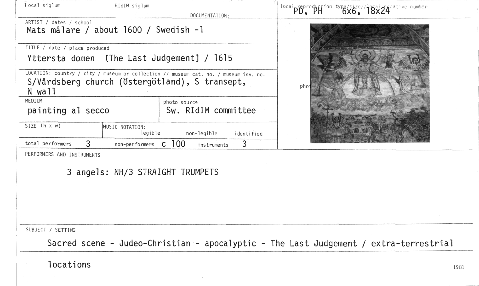 //// local siglum //// RIdIM siglum //// DOCUMENTATION: //// localmsp:oliffion typiä6ze,. itj3254gat ve number //// pho //// ARTIST / dates / school //// Mats målare / about 1600 / Swedish -1 //// TITLE / date / place produced //// Yttersta domen [The Last Judgement] / 1615 //// LOCATION: country / city / museum or collection // museum cat. no. / museum inv. no. //// S/Vårdsberg church (Östergötland), S transept, N wall //// MEDIUM //// painting al secco //// SIZE (h x w) //// non-legible identified //// total performers 3 non-performers C 100 instruments 3 //// MUSIC NOTATION: //// legible //// photo source //// Sw. RIdIM committee //// PERFORMERS AND INSTRUMENTS //// 3 angels: NH/3 STRAIGHT TRUMPETS //// SUBJECT / SETTING //// Sacred scene - Judeo-Christian - apocalyptic - The Last Judgement / extra-terrestrial //// locations //// 1981 ////