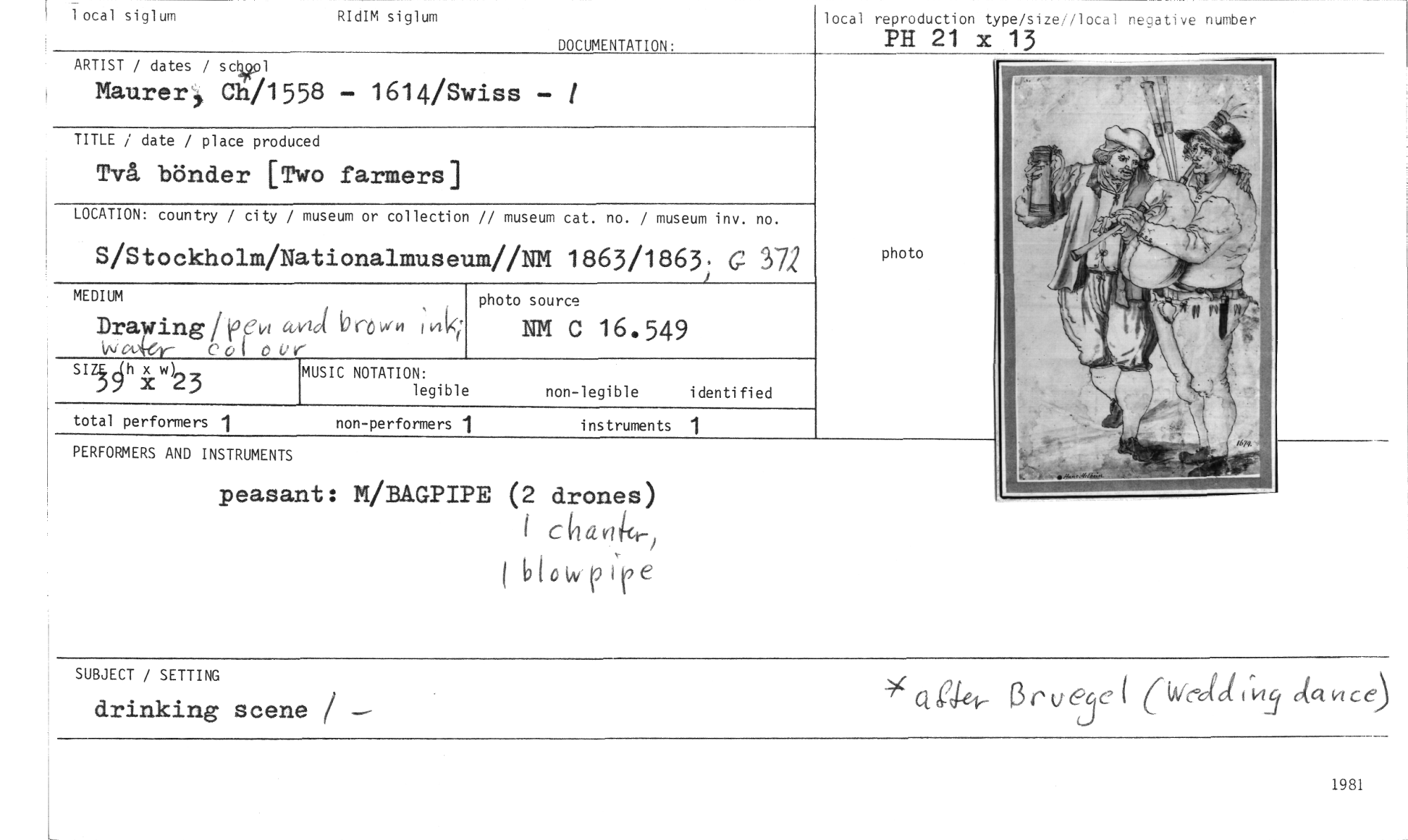//// lotal reproduction type/sizei/local negative nurober //// PH 21 x 13 //// DOCUMENTATION: //// 1 otal siglum RIdIM siglum //// non-legible identified //// MEDIUM //// Draying/Cevi kvid b ce, w //// wc 'r CO( 01:r //// IZS.h w)23 MUSIC NOTATION: //// legible //// total performers 1 //// non-performers 1 instruments 1 //// SUBJECT / SETTING //// drinking scene / — //// ' a eSei, e,rue ( W(4 davice) //// ARTIST / dates / school //// Maurer Ch/1558 - 1614/Swiss - //// TITLE / date / place produced //// Två bönder [Two farmers] //// LOCATION: country / city / museum or collection // museum cat. no. / museum inv. no. //// S/Stockholm/Nationalmuseum//NM 1863/1863. G 372 //// PERFORMERS AND INSTRUMENTS //// peasant: M/BAGPIPE (2 drones) I dicte4r) blowvire //// ;vik //// photo source //// NM C 16.549 //// photo //// 1981 ////