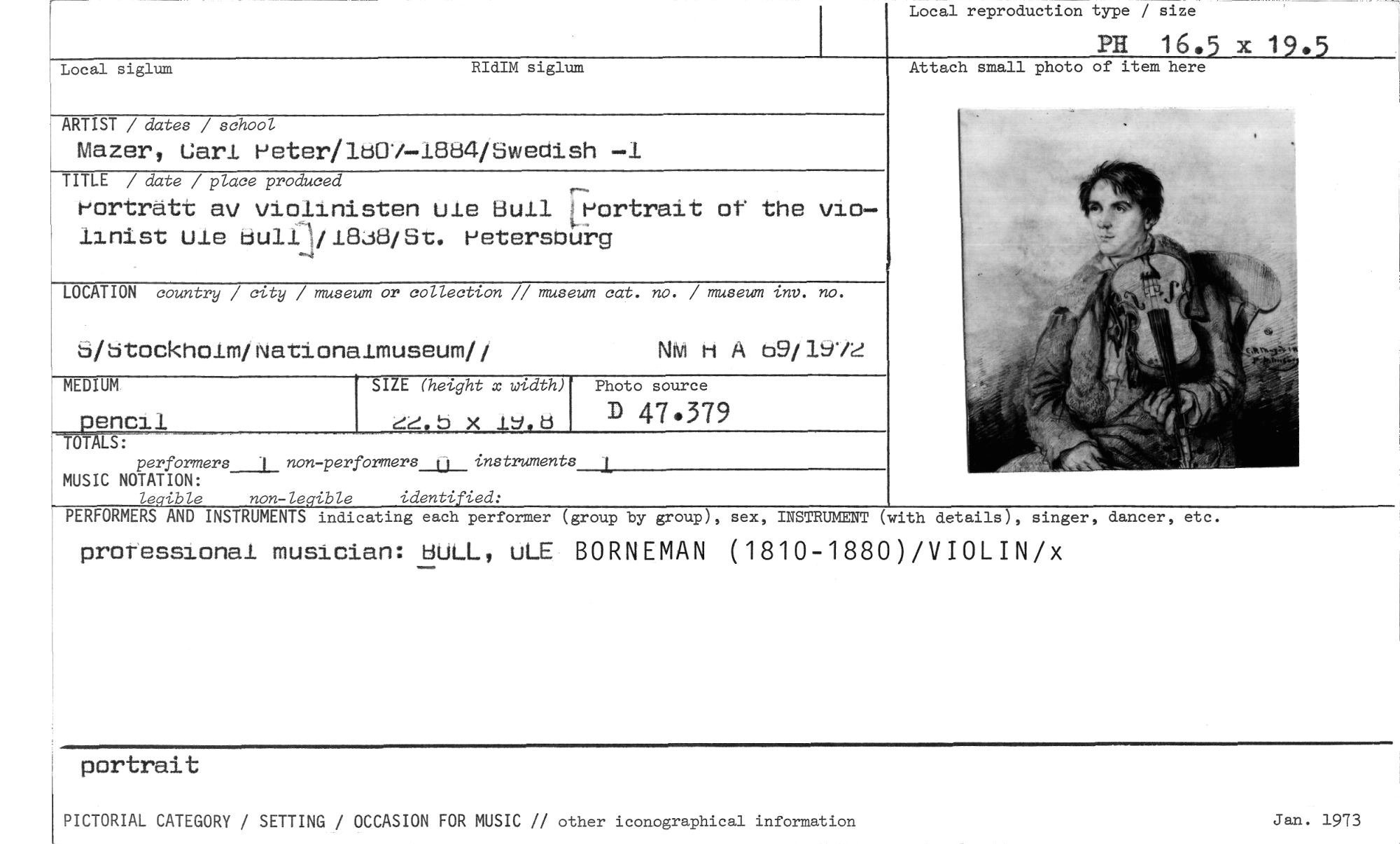 //// Local reproduction type / size //// PH 16.5 x 19.5 //// Local siglum RIdIM siglum Attach small photo of item here //// .4.,:: //// ARTIST / dates / school //// Mazer, Carl Heter/lB07-1B154/Sweaish —i //// TITLE / date / place produced //// 1,ortratt av violinisten ute Bull t-Jortrait of the vio- //// linist uie buliI418J8/St. HetersbUrg //// LOCATION country / city / museum or collection // museum cat. no. / museum inv. no. //// B/Btockholm/Nationalmuseum// Nid m A (39/1972 //// MEDIUM SIZE (height x width) Photo source //// pencil b x 19.d D 47.379 //// —J //// TÖTALS: 1 //// performers_i_ non-performers_jj_instruments MUSIC NOTATION: //// legible non-legible identified: //// //// PERFORMERS AND INSTRUMENTS indicating each performer (group by group), sex, INSTRUMENT (with details), singer, dancer, etc. //// proressional musician: BuLL, uLE BORNEMAN (1810-1880)/VIOLIN/x //// portrait //// PICTORIAL CATEGORY / SETTING / OCCASION FOR MUSIC // other iconographical information Jan. 1973 ////