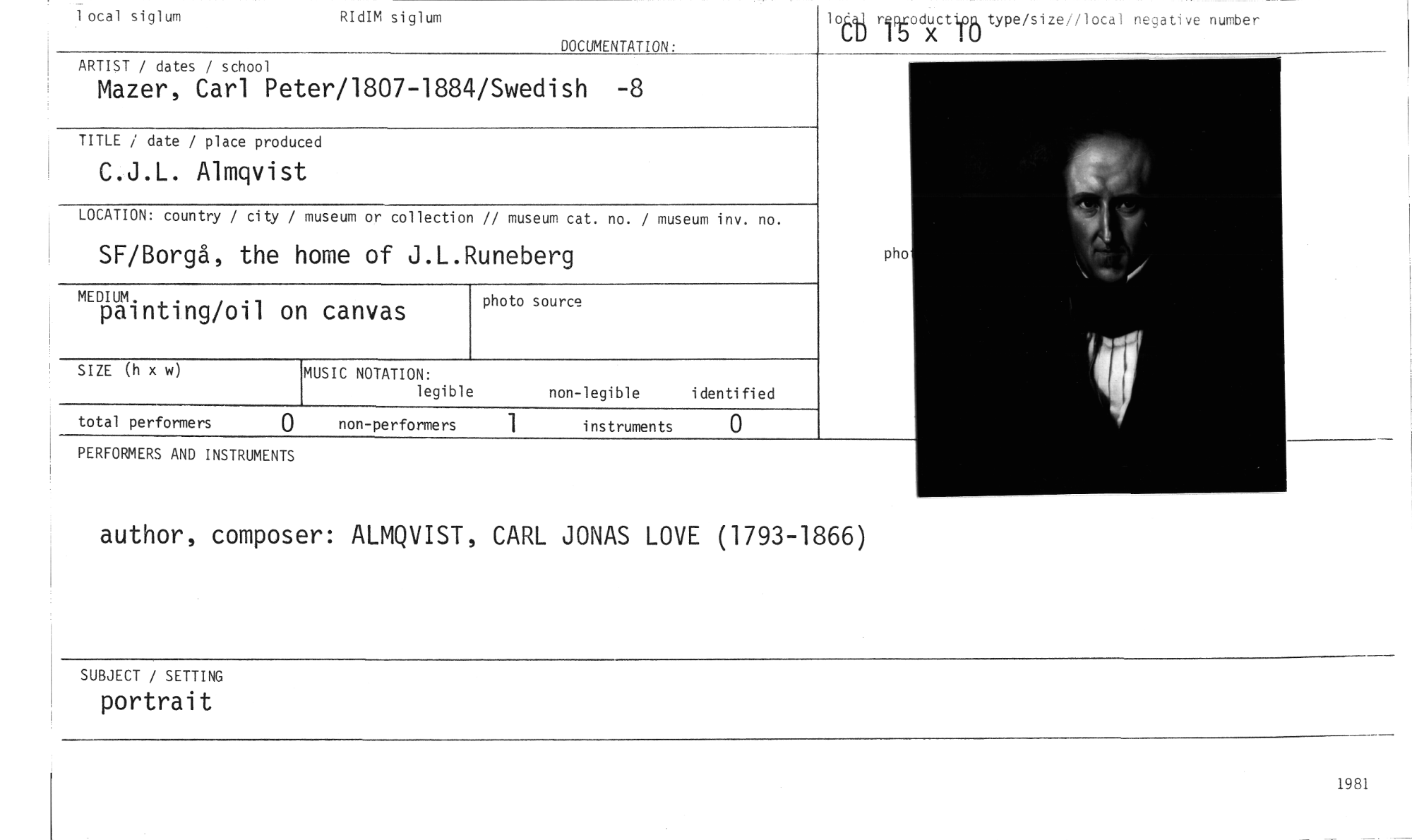 //// 1 ocal siglum RIdIM siglum //// DOCUMENTATION: //// ARTIST / dates / school //// Mazer, Carl Peter/1807-1884/Swedish -8 //// lodj rit od)u(ctiit type/sizel/local negative number //// TITLE / date / place produced //// C.J.L. Almqvist //// LOCATION: country / city / museum or collection // museum cat. no. / museum inv. no. //// pho //// photo source //// SIZE (h x w //// total performers 0 non-performers instruments 0 //// PERFORMERS AND INSTRUMENTS //// author, composer: ALMQVIST, CARL JONAS LOVE (1793-1866) //// MEDIUM. //// painting/oil on canvas //// SF/Borgå, the home of J.L.Runeberg //// MUSIC NOTATION: //// legible non-legible identified //// SUBJECT / SETTING //// portrait //// 1981 ////