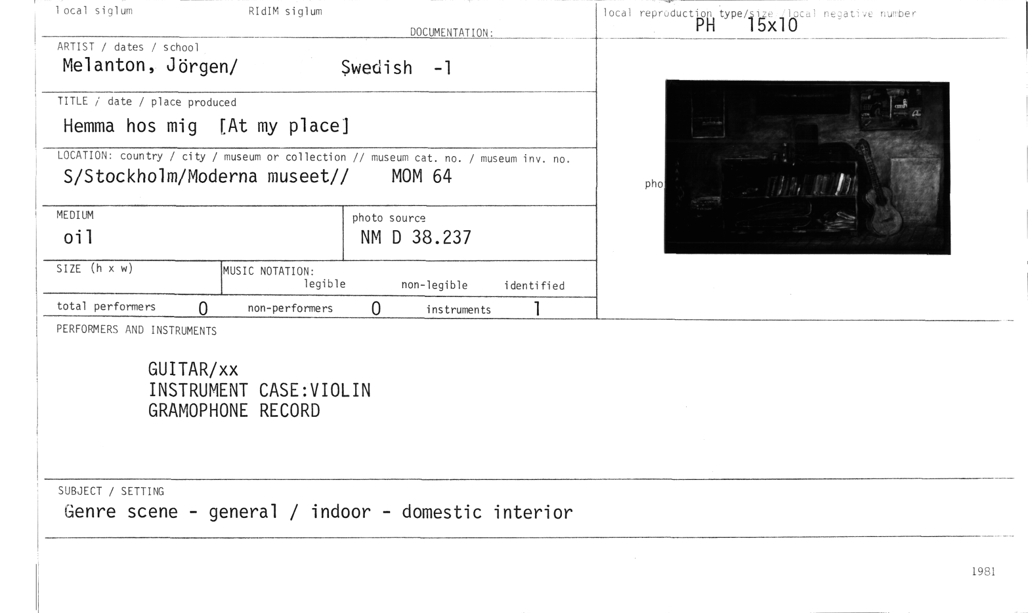 //// lotal siglum RIdIM siglum //// DOCUMENTATION: //// lotal reproductiop.type/.51 elotal negative munber //// PH 15 //// ARTIST / dates / school Swedish -1 //// Melanton, Jörgen/ //// TITLE / date / place produced //// Hemma hos mig [At my place] //// LOCATION: country / city / museum or collection // museum cat. no. / museum inv. no. //// S/Stockholm/Moderna museet// MOM 64 //// photo source //// NM D 38.237 //// MEDIUM Oil //// pho //// SIZE //// (h x w //// MUSIC NOTATION: //// legible //// non-legible identified //// total performers 0 non-performers instruments 1 //// PERFORMERS AND INSTRUMENTS //// GUITAR/xx //// INSTRUMENT CASE:VIOLIN GRAMOPHONE RECORD //// SUBJECT / SETTING //// Genre scene - general / indoor - domestic interior //// 1981 ////
