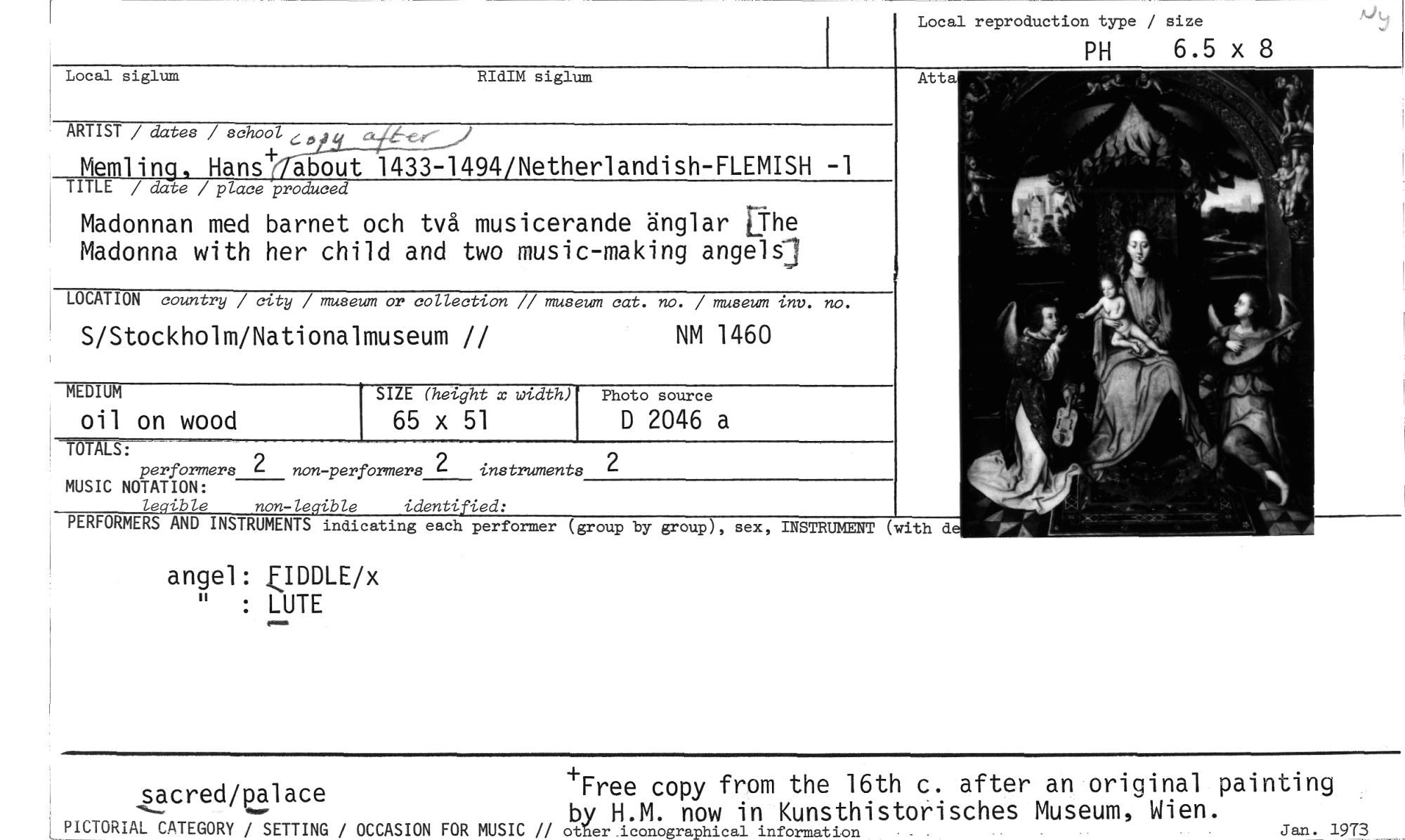 //// Local reproduction type / size //// pH 6.5 x //// NM 1460 //// S/Stockholm/Nationalmuseum // //// Photo source //// D 2046 a //// MEDIUM //// oil on wood //// SIZE (height x width) //// 65 x 51 //// non-performers //// TOTALS: //// performers 2 //// MUSIC NOTATION: //// legible non-legible identified: //// PERFORMERS AND INSTRUMENTS indicating each performer //// Local siglum RIdIM siglum //// ARTIST / dates / school c,„.(6, //// Memling, Hans+ about 1433-1494/Netherlandish-FLEMISH -1 //// TITLE / date / place produced //// Madonnan med barnet och två musicerande änglar [The //// Madonna with her child and two music-making angelSg //// LOCATION country / city / museum or collection // museum cat. no. / museum inv. no. //// angel: Z.IDDLE/x //// : LUTE //// 2 //// instruments //// 2 //// Atta //// (group by group), sex, INSTRUMENT (with d //// sacred/Palace +Free copy from the 16th c. after an original painting //// by H.M. now in Kunsthistorisches Museum, Wien. //// LPICTORIAL CATEGORY / SETTING / OCCASION FOR MUSIC // other iconographical information Jan. 1973 ////