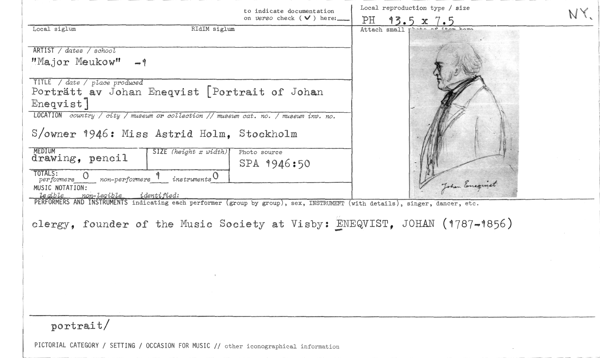 //// to indicate documentation //// on verso check (V ) here:_--- //// Local reproduction type / size //// PH 13.5 x 7.5 //// Local siglum RIdIM siglum //// TITLE / date / place prodwed //// Porträtt av Johan Enegoist [Portrait of Johan Eneqvist] //// LOCATION country,/ city / museum or collection // museum cat. no. / museum inv. no. //// S/owner 1946: Miss Astrid Holm, Stockholm //// T' LS: //// per formers ° non-performers 1 instruments //// MUSIC NOTATION: //// leca/e non-leaible identified: //// PERFORMERS AND INSTRUMENTS indicating each performer (group by group), sex, INSTRUMENT (with //// —19M»1 E (height x width) Photo source //// drawing, pencil SPA 1946:50 //// //// //// ARTIST / dates / school //// "Major Meukow" -1 //// details), singer, dancer, etc. //// clergy, founder of the Music Society at Visby: ENEQVIST, JOHAN (1787-1856) //// Portrait/ //// PICTORIAL CATEGORY / SETTING / OCCASION FOR MUSIC // other iconographical information ////