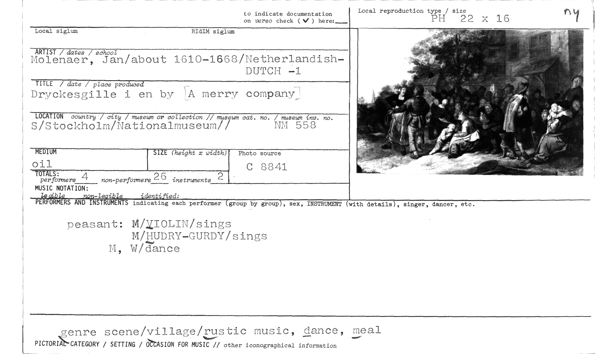 //// to indicate documentation Local reproduction type / size //// on verso check (V) here:...— PH 22 X 16 //// Local siglum //// RIdIM siglum //// ARTIST / dater / school //// Molenaer, Jan/about 1610-1868/Netherlandish- //// DUTCH -1 //// TITLE / date / place produced //// Dryckesgille i en by EK merry company: //// LOCATION country / city / museum or collection // museum cat. no. / museum tnv. no. //// S/Stockholm/Nationalmuseum// NM 558 //// MEDIUM //// oul //// Photo source //// SIZE (height x width) //// 7R Art: //// per formers non-per formers26 instruments //// C 8841 //// MUSIC NOTATION: //// lecible non-leaible igientified; //// PERFORMERS AND INSTRUMENTS indicating each performer (group by group), sex, //// INSTRUMENT (with details), //// singer, daner, etc. //// peasant: 14/2IOLIN/sings M/ZUDRY-GURDY/sings M, W/dance //// .5 ru //// enre scene/village/stic music, dance, meal //// PICTORIAI-CATEGORY / SETTING / ChASION FOR MUSIC // other iconographical information ////