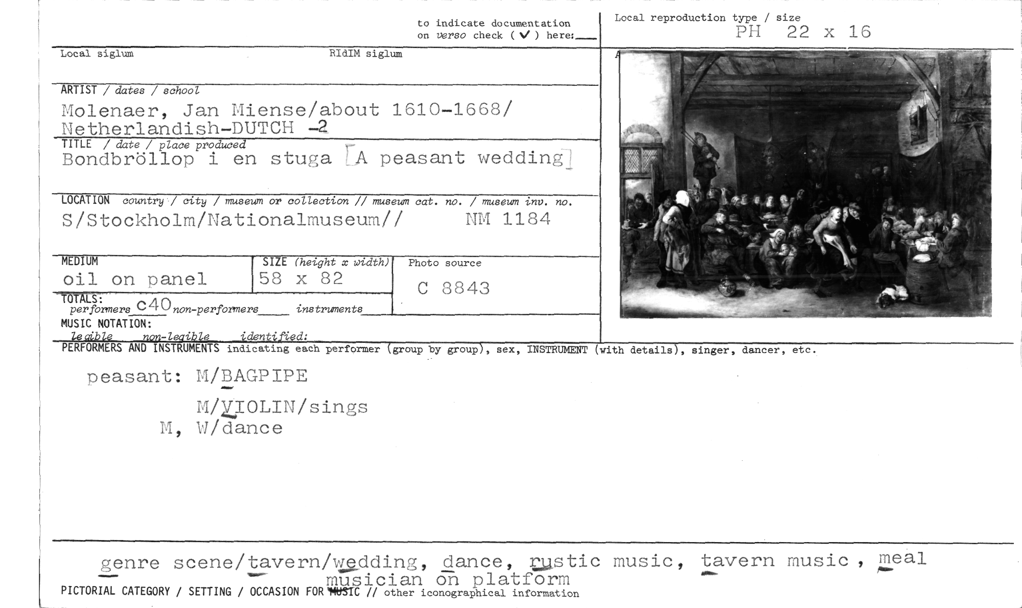//// to indicate documentation on verso check ( ) //// Local reproduction type / size //// PH 22 x 16 //// Local siglum RIdIM siglum //// ARTIST / dates / school //// Molenaer, Jan Miense/about 1610-1668/ Netherlandish-DUTCH //// TITLE / date / place produced //// Bondbröllop i en stuga [A peasant wedding] //// LOCATION countryl city / museum or collection I/ museum cat. no. / museum tnv. no. //// S/Stockholm/Nationalmuseum// NM 1184 //// MEDIUM //// On on panel //// per formers (:40 non-performers instruments //// MUSIC NOTATION: //// 'den //// SIZE (height x width) //// 58 x 82 //// Photo source //// C 8843 //// indicating each //// performer group by group , sex, INSTRUMENT (with details), singer, dancer, etc. //// R ORMERS AND INSTRUMEN //// peasant: M/BAGPIPE //// M/ZIOLIN/sings M, W/dance //// genre scene/tavern/udding, dance, custic music, tavern music, meal //// •••^•^•• musician on platform //// PICTORIAL CATEGORY / SETTING / OCCASION FORNIISTC // other iconographical information ////