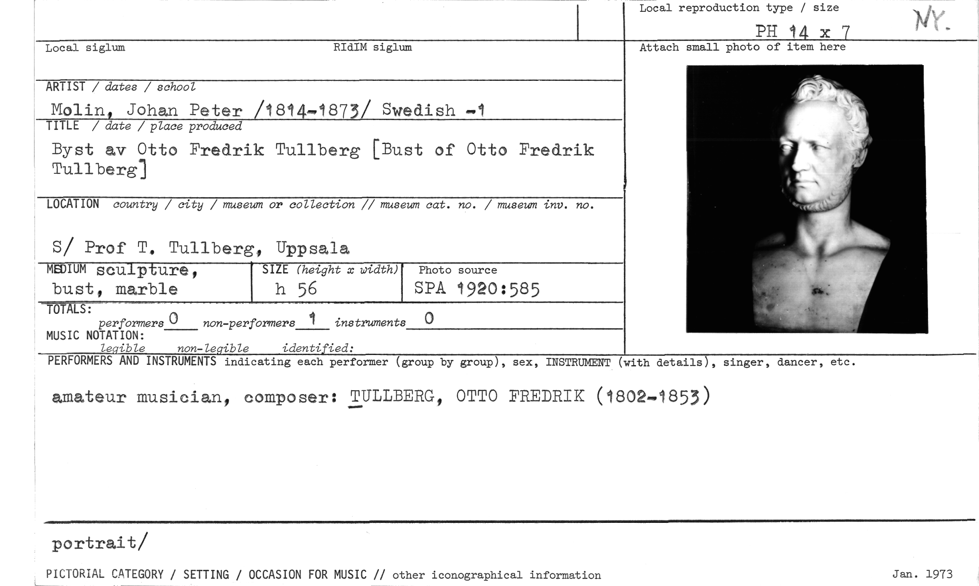 //// Local reproduction type / size //// PH 14 x 7 //// Local siglum RIdIM siglum //// Attach small photo of item here //// ARTIST / dates / school //// Molin, Johan Peter /1814-1873/ Swedish —1 //// TITLE / date / place produced //// Byst av Otto Fredrik Tullberg [Bust of Otto Fredrik Tullberg] //// LOCATION country / city / museum or collection // museum cat. no. / museum lm). no. //// S/ Prof T. Tullberg, Uppsala //// MEDIUM scuipture, bust, marble SIZE (height x width) Photo source //// h 56 SPÅ 1920:585 //// //// TO ALS: //// performers 0 non-performers 1 instruments //// MUSIC NOTATION: //// legible non-legible identified: //// PERFORMERS AND INSTRUMENTS indicating each performer (group by group), sex, INSTRUMENT (with details), singer, //// amateur musician, composer: TULLBERG, OTTO FREDRIK (1802-1853) //// 0 //// dancer, etc. //// portrait/ //// PICTORIAL CATEGORY / SETTING / OCCASION FOR MUSIC // other iconographical information Jan. 1973 ////