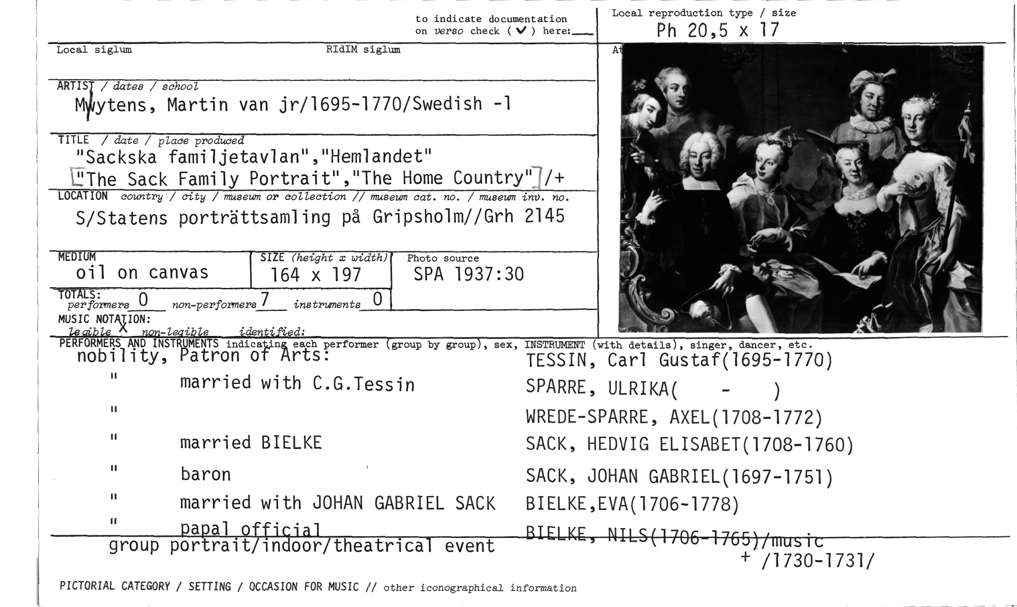//// to indicate documentation //// on verso check (4./ ) here: //// Local reproduction type / size //// Ph 20,5 x 17 //// Local siglum RIdIM siglum //// ARTIS / dates / school //// M ytens, Martin van jr/1695-1770/Swedish -1 //// TITLE / date / place produced //// "Sackska familjetavlan","Hemlandet" //// eThe Sack Family Portrait","The Home Country"7/+ //// LOCATION country / city / museum or collection // museum cat. no. / museum inV. no. //// S/Statens porträttsamling på Gripsholm//Grh 2145 //// SIZE (height x width) //// SPA 1937:30 //// PERFORMERS AND INSTRUMENTS indictnrach performer Cgroup by group), //// nobility, atron o rts: //// married with C.G.Tessin //// married BIELKE //// baron //// married with JOHAN GABRIEL SACK //// papal official //// group portrait/indoor/theatrical event //// MEDIUM //// oil on canvas //// 1 OTALS: //// per formers 0 non-per formers 7 instruments //// MUSIC NOTAjION: //// tecible non-leaible identified; //// 164 x 197 //// Photo source //// /1730-1731/ //// sex, INSTRUMENT (with details), singer, dancer, etc. //// TESSIN, Carl Gustaf(1695-1770) SPARRE, ULRIKA( - ) //// WREDE-SPARRE, AXEL(1708-1772) SACK, HEDVIG ELISABET(1708-1760) //// SACK, JOHAN GABRIEL(1697-1751) BIELKE,EVA(1706-1778) //// RIELKE, g-LS{1796 17-65J/musk. //// PICTORIAL CATEGORY / SETTING / OCCASION FOR MUSIC // other iconographical information ////