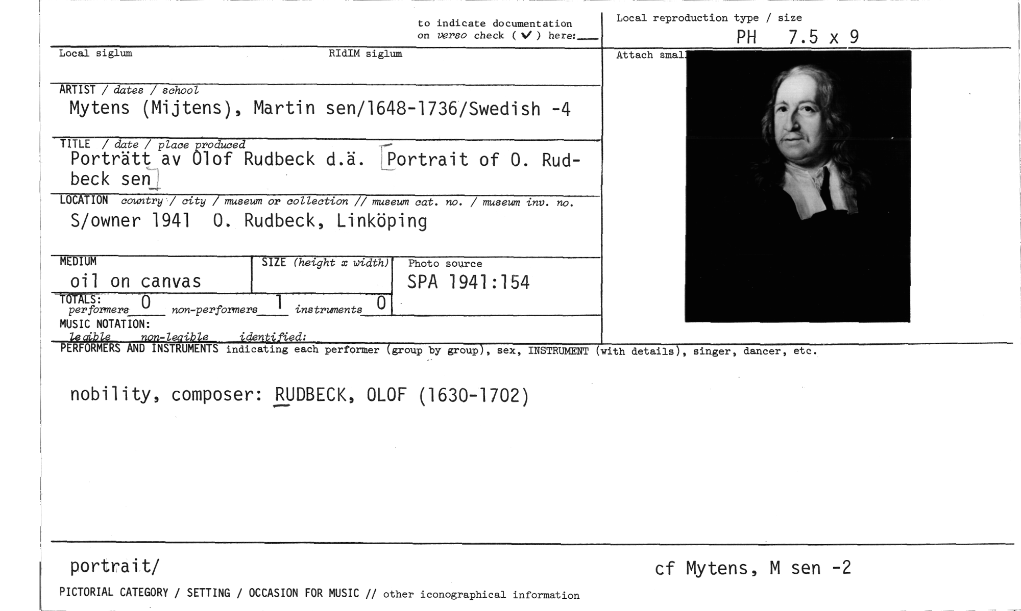 //// to indicate documentation on versa check ( ) //// PH 7.5 x 9 //// Local reproduction type / size //// Local siglum RIdIM siglum //// ARTIST / dates / school //// Mytens (Mijtens), Martin sen/1648-1736/Swedish -4 //// TITLE / date / placeproduced //// Porträtt av Olof Rudbeck d.ä. Portrait of 0. Rud- , //// beck sen ' //// LOCATION country / city / museum or collection // museum cat. no. / museum tnv. no. //// S/owner 1941 0. Rudbeck, Linköping //// SIZE (height x width) //// Attach smal //// itt //// TETALS: //// per formers 0non-performers 1 instruments //// MUSIC NOTATION: //// lecible non-leaible identiAsel; //// MEDIUM //// oil on canvas //// Photo source //// SPA 1941:154 //// PERFORMERS AND INSTRUMENTS indicating each performer fgroup by group), sex, INSTRUMENT (with details), singer, dancer, etc. //// nobility, composer: RUDBECK, OLOF (1630-1702) //// portrait/ cf Mytens, M sen -2 //// PICTORIAL CATEGORY / SETTING / OCCASION FOR MUSIC // other iconographical information ////