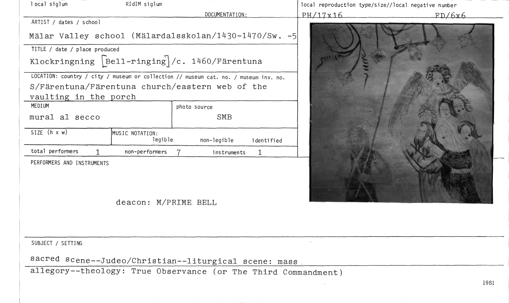 //// 1981 //// instruments 1 //// total performers 1 non-performers 7 //// local reproduction type/size//local negative number //// 1"14/175c1 6 FD/6Y6 //// DOCUMENTATION: //// ARTIST / dates / school //// Mälar Valley school (Mälardalsskolan/1430-1470/Sw. -5 //// TITLE / date / place produced //// Klockringning Bell-ringing-Pc. 1460/Färentuna //// LOCATION: country / city / museum or collection // museum cat. no. / moeuminv. no. //// S/Färentuna/Färentuna church/eastern web of the vaulting in the porch //// MEDIUM //// mural al secco //// MUSIC NOTATION: //// legible non-legible identified //// PERFORMERS AND INSTRUMENTS //// deacon: M/PRIME BELL //// SIZE (h x w) //// photo source //// SMB //// SUBJECT / SETTING //// sacred scene--Judeo/Christian--liturgical scene: mass //// allegory--theology: True Observance (or The Third Commandment) //// RIdIM siglum //// 1 ocal siglum ////